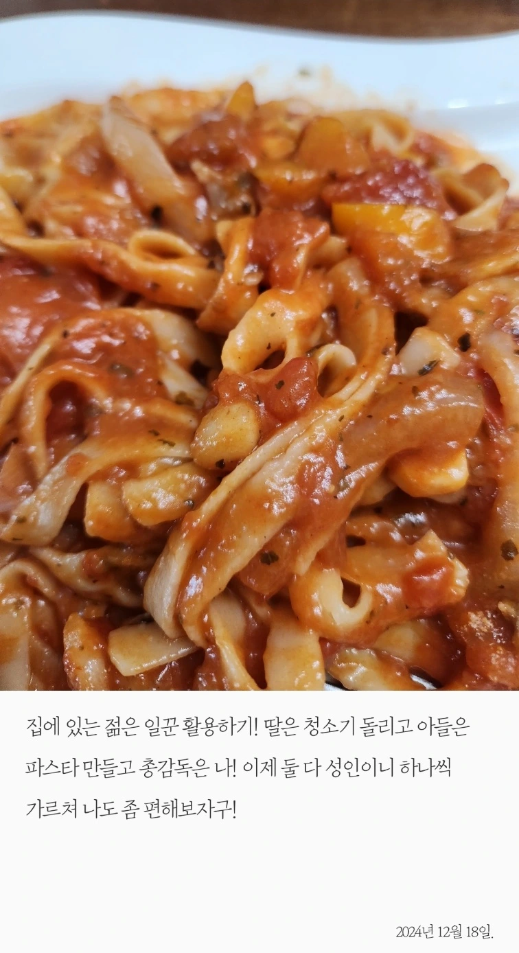 엄마의 요리 해방을 위해 아들은 볼로네제 파스타를 만들고 딸은 소고기 피자를 만들었다.