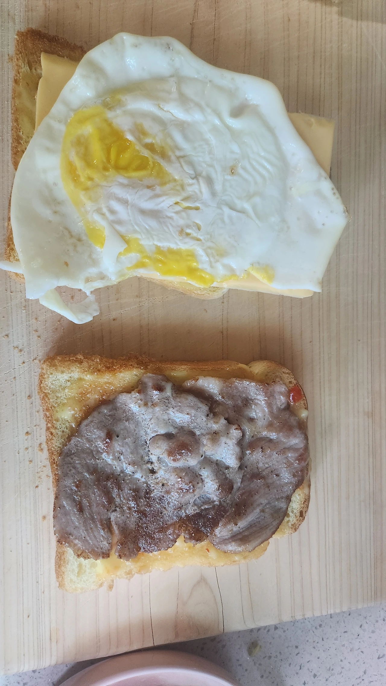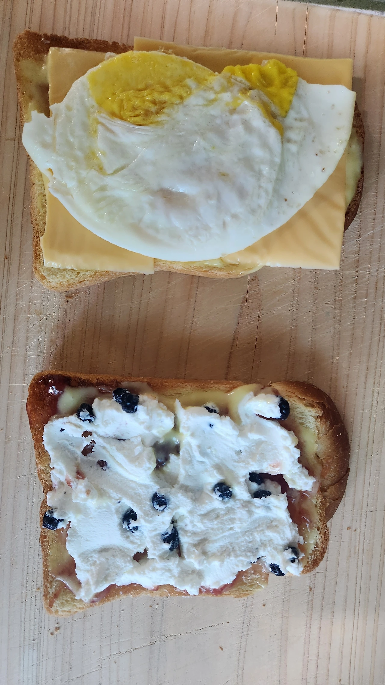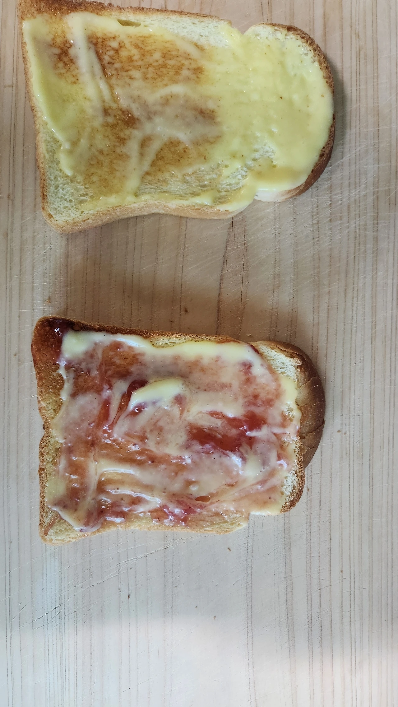 식빵 양쪽 모두 소스를 바르는 대신 한쪽에는 소스를 한쪽에는 잼과 소스를 섞어 발랐습니다.