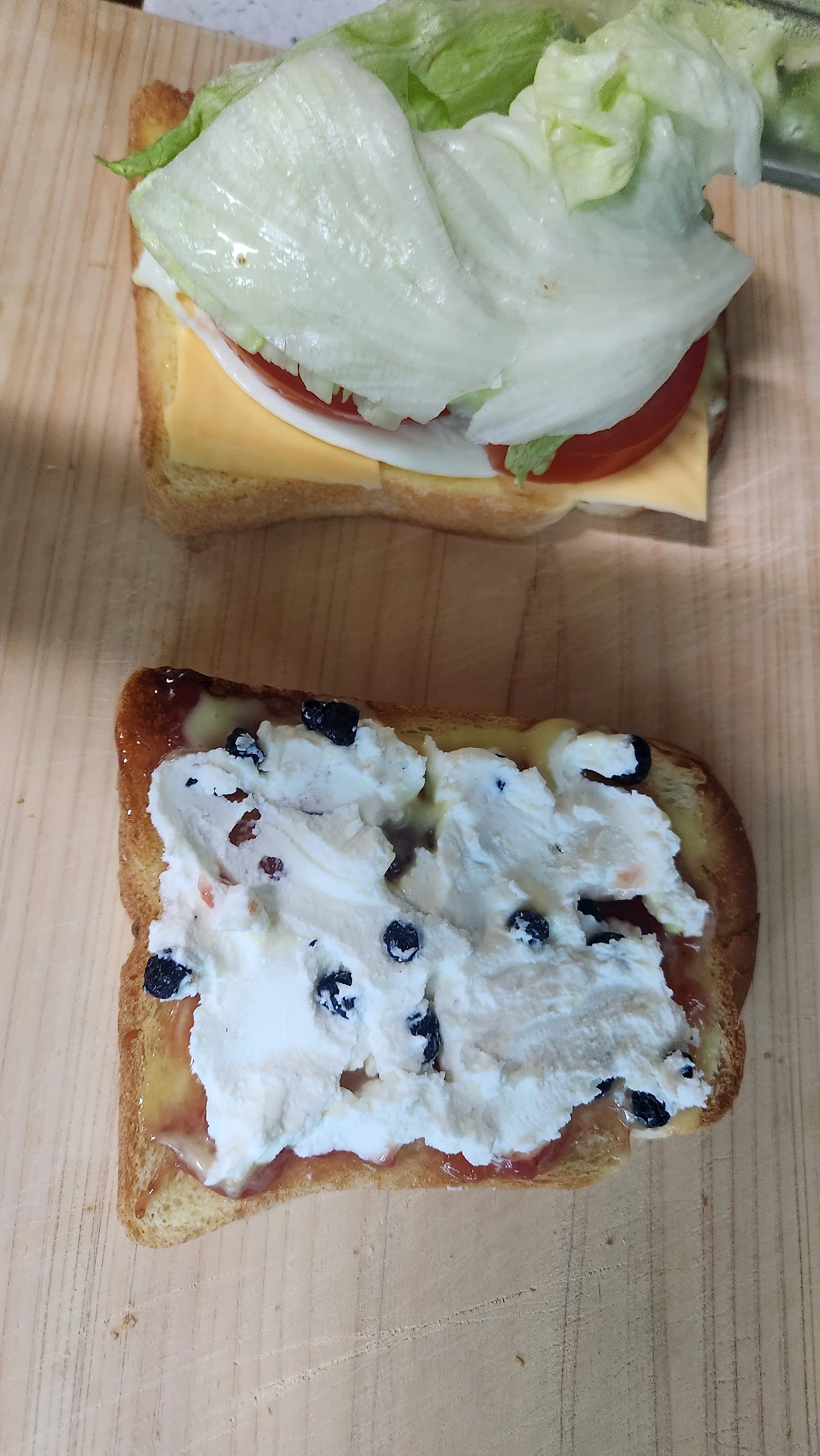 햄을 대신해 리코타치즈에 건블루베리를 넣은 뒤 빵에 발랐습니다.