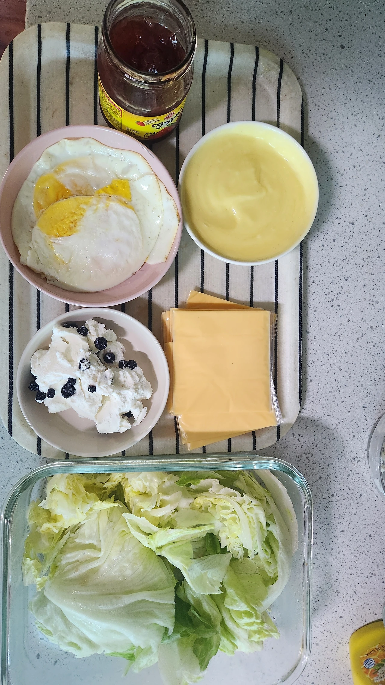 식빵은 토스트기에 굽고, 계란은 프라이팬에 굽고, 토마토는 썰어서 물기를 닦고, 양상추는 씻어서 물기를 빼두었습니다. 그리고 호기롭게 오이피클까지 만들었습니다.