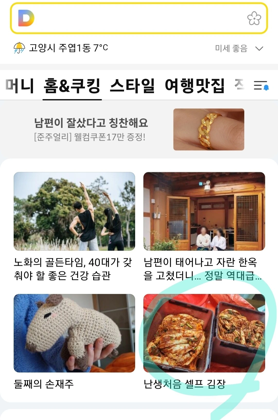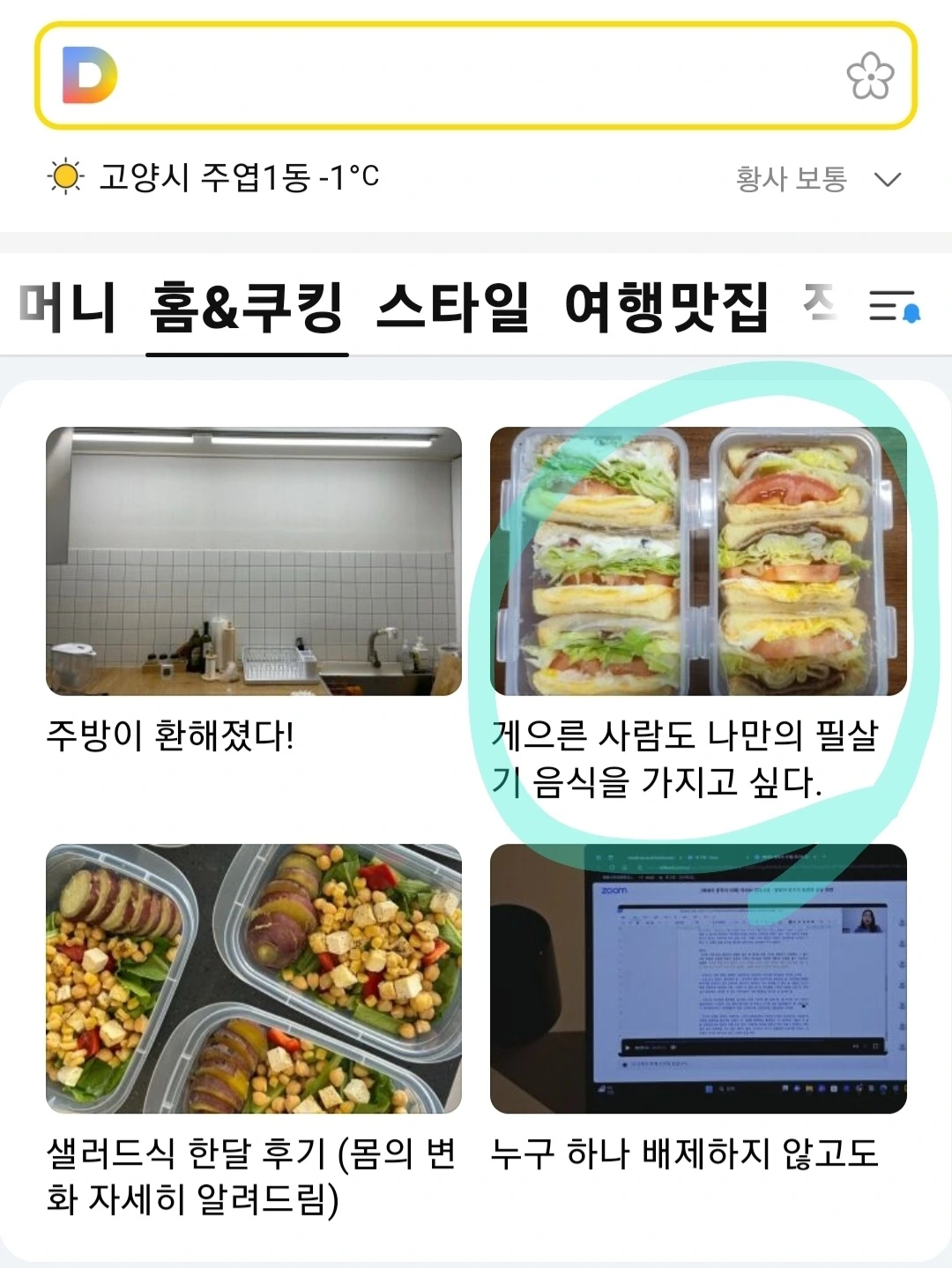 설마 내 글이 다음에 걸린 건가? 콩닥대는 가슴을 안고 다음 포털을 열었다. 화면에 엄지를 빠르게 날려 홈쿠킹 섹션으로 갔다. 내 글은 보이지 않았다. 혹시나 하는 마음에 새로고침을 하니 내가 만든 샌드위치 사진이 클로즈업되어 눈에 들어온다.