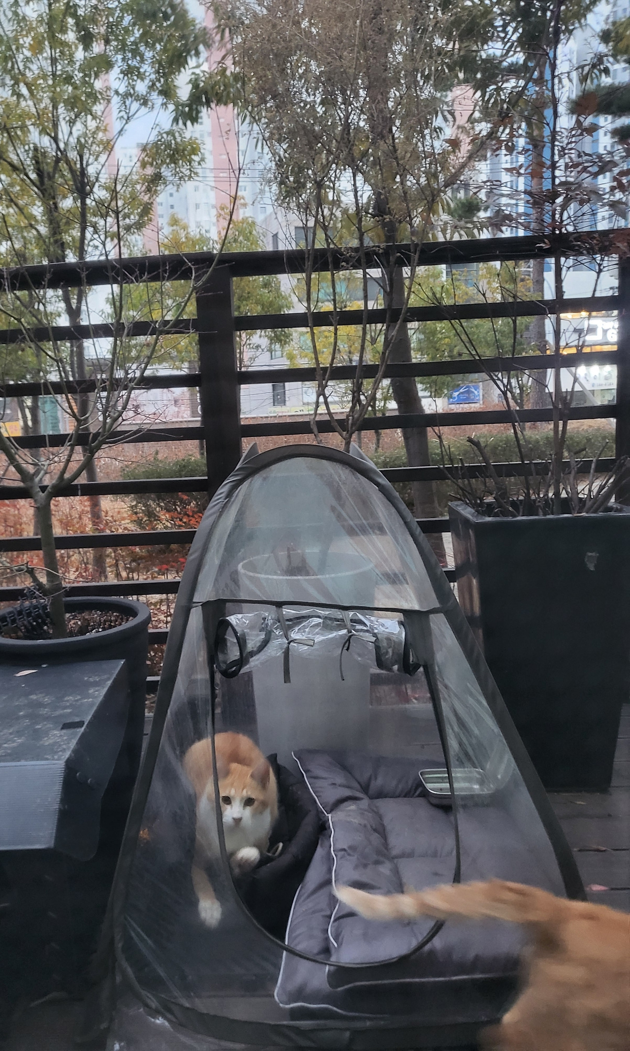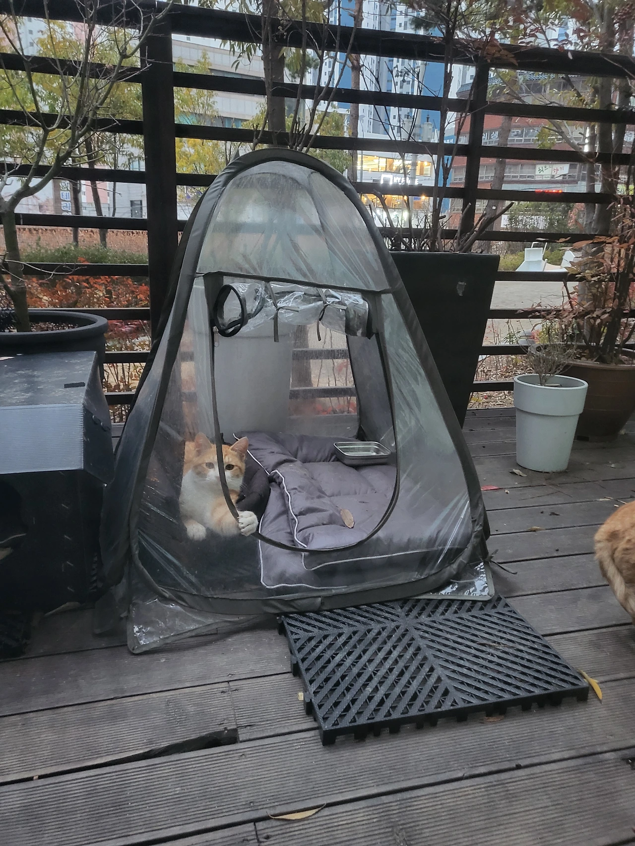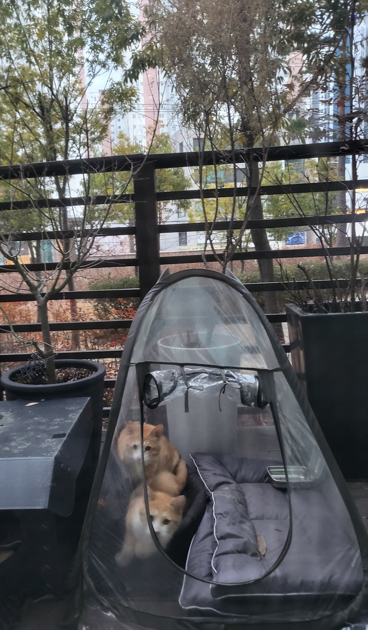 문을 여니 고양이들이 비닐집에서 나왔다.