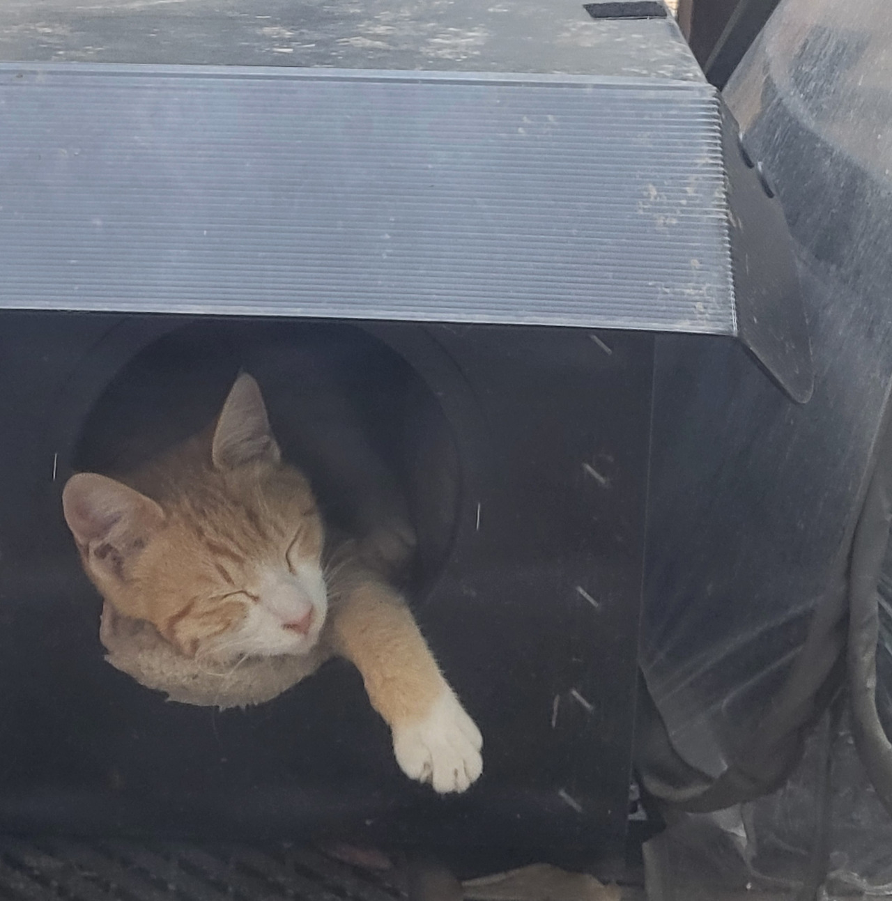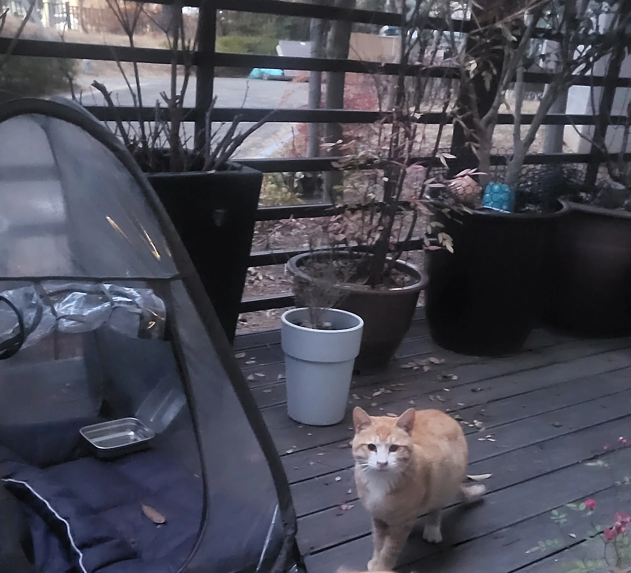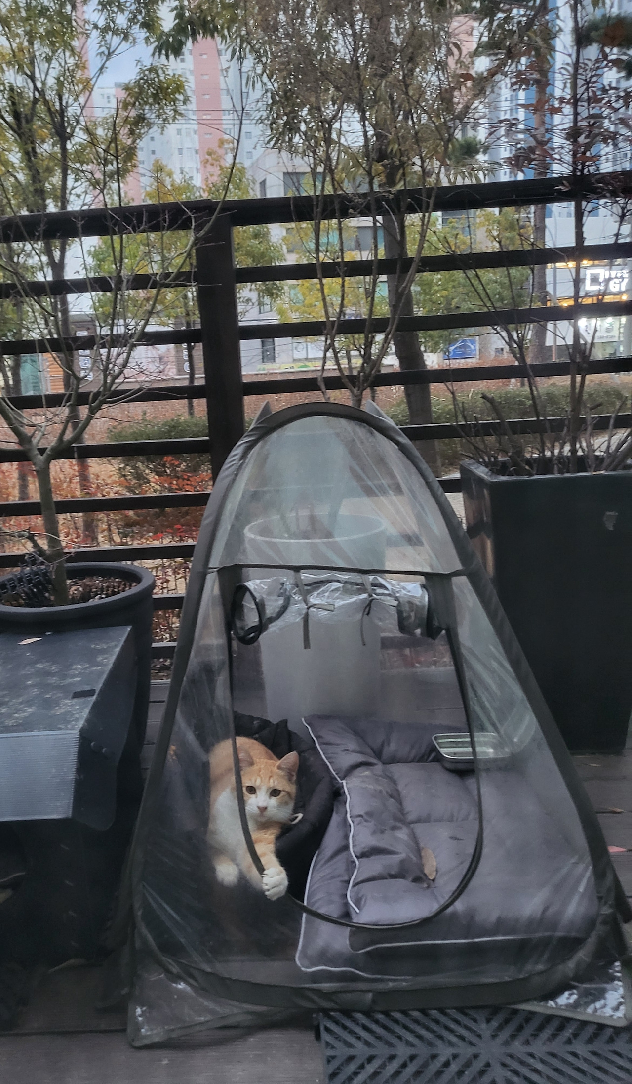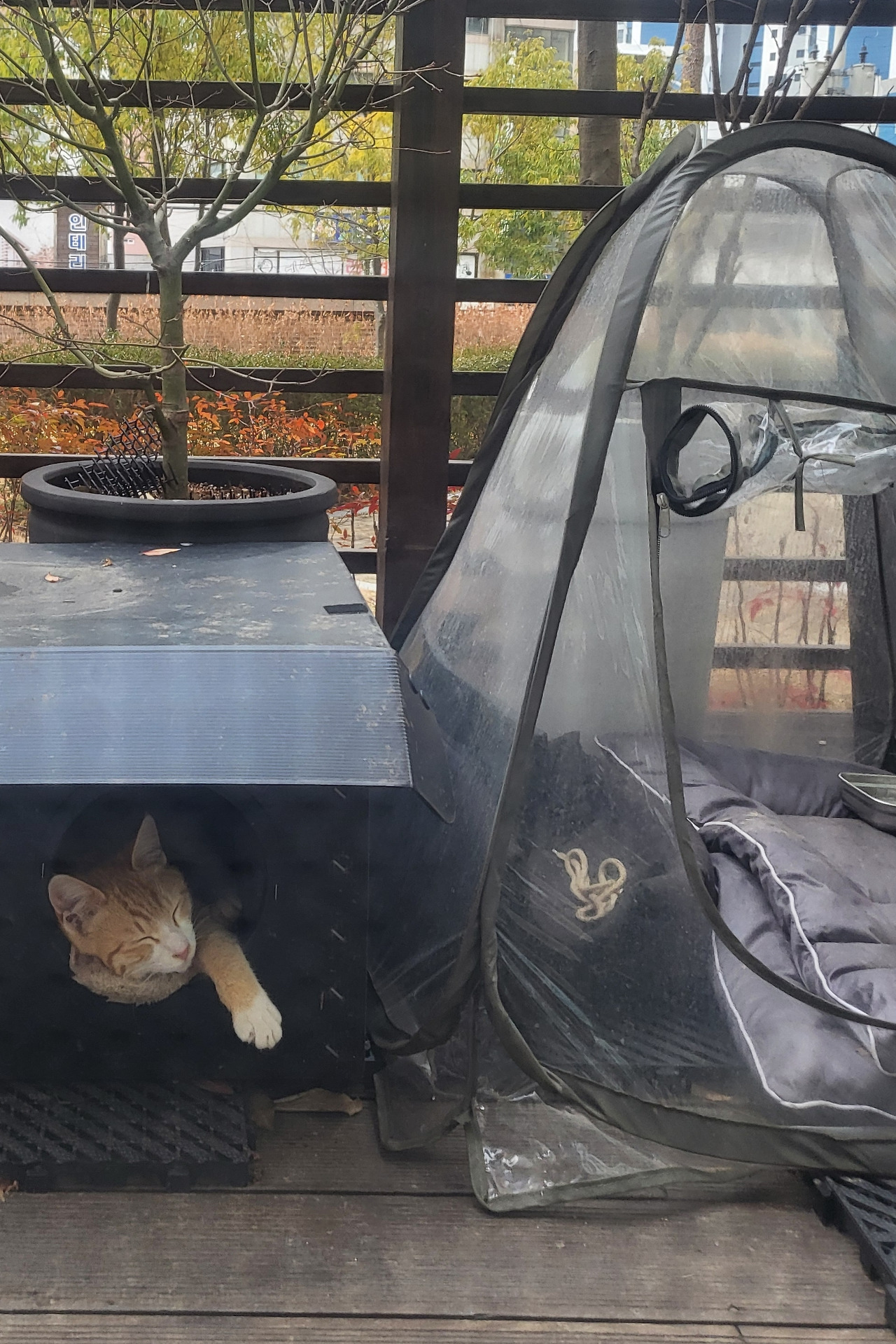 문을 여니 고양이들이 비닐집에서 나왔다.