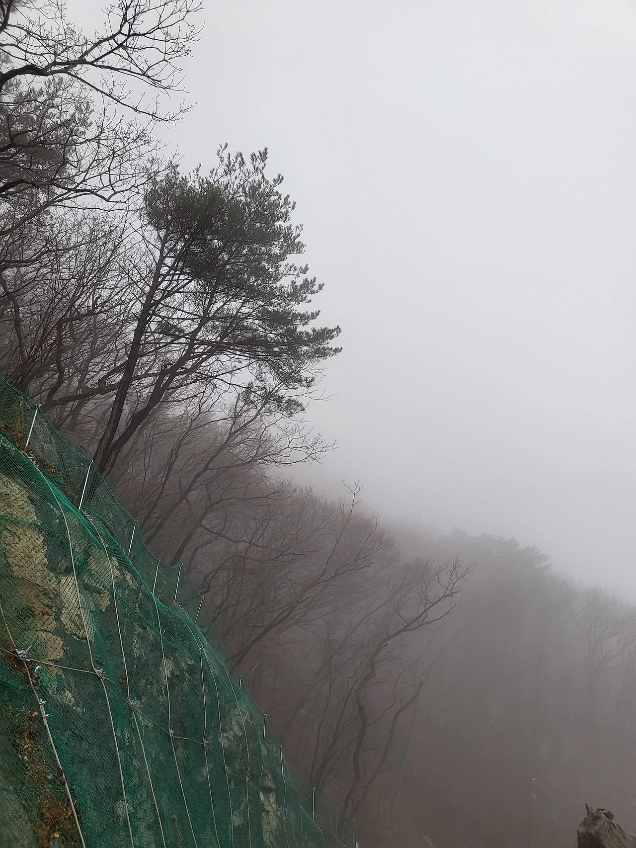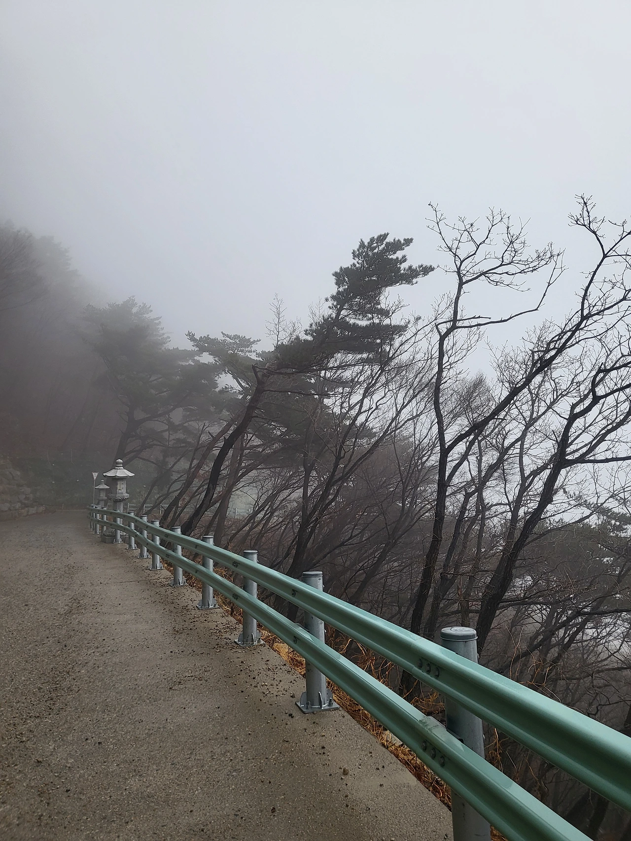 바람까지 불어 살짝 후회가 되었다. 춥고 비오는데 위험하게 왜 왔을까? 돌아갈까? 잠시 생각했다. 하지만 내가 오자고 했기에 돌아가자는 말을 하지 못했다. 안개 때문에 끝이 보이지 않을 뿐 끝은 어딘지 아니까, 하는 생각도 들었다.