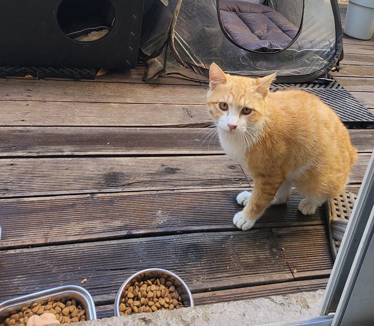 번개와 나비가 돌아간 뒤에야 우유가 먹이를 먹으러 왔다. 나는 얼른 츄르를 담아주었다. 우유는 힘이 없어 보인다.