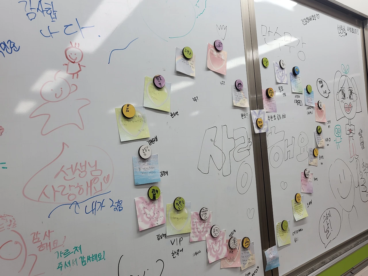 5교시에 아이들이 나를 부르자 교실로 갔다. 반 아이들이 모두 쪽지를 썼고 그 쪽지들이 칠판 가득 붙어 있었다. 칠판에는 하트와 나에 대한 메시지들이 적혀 있었다. 그러곤 아이들이 분홍 카네이션 바구니를 건네었다. 아차. 분홍색 좋아한다고 할걸.