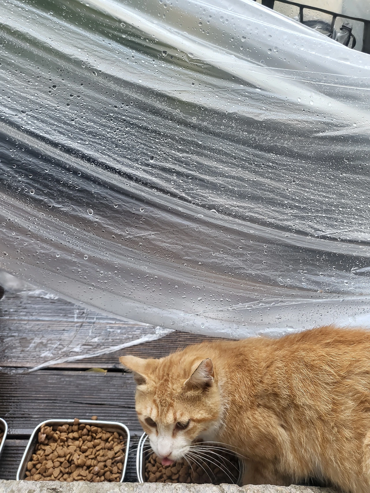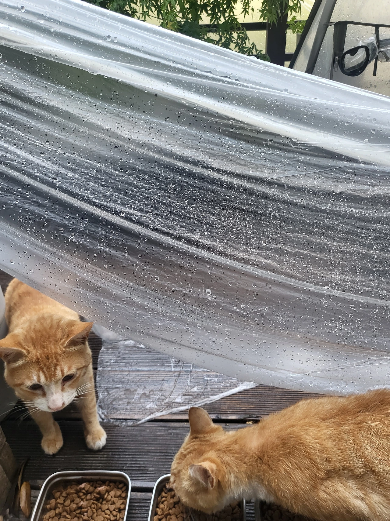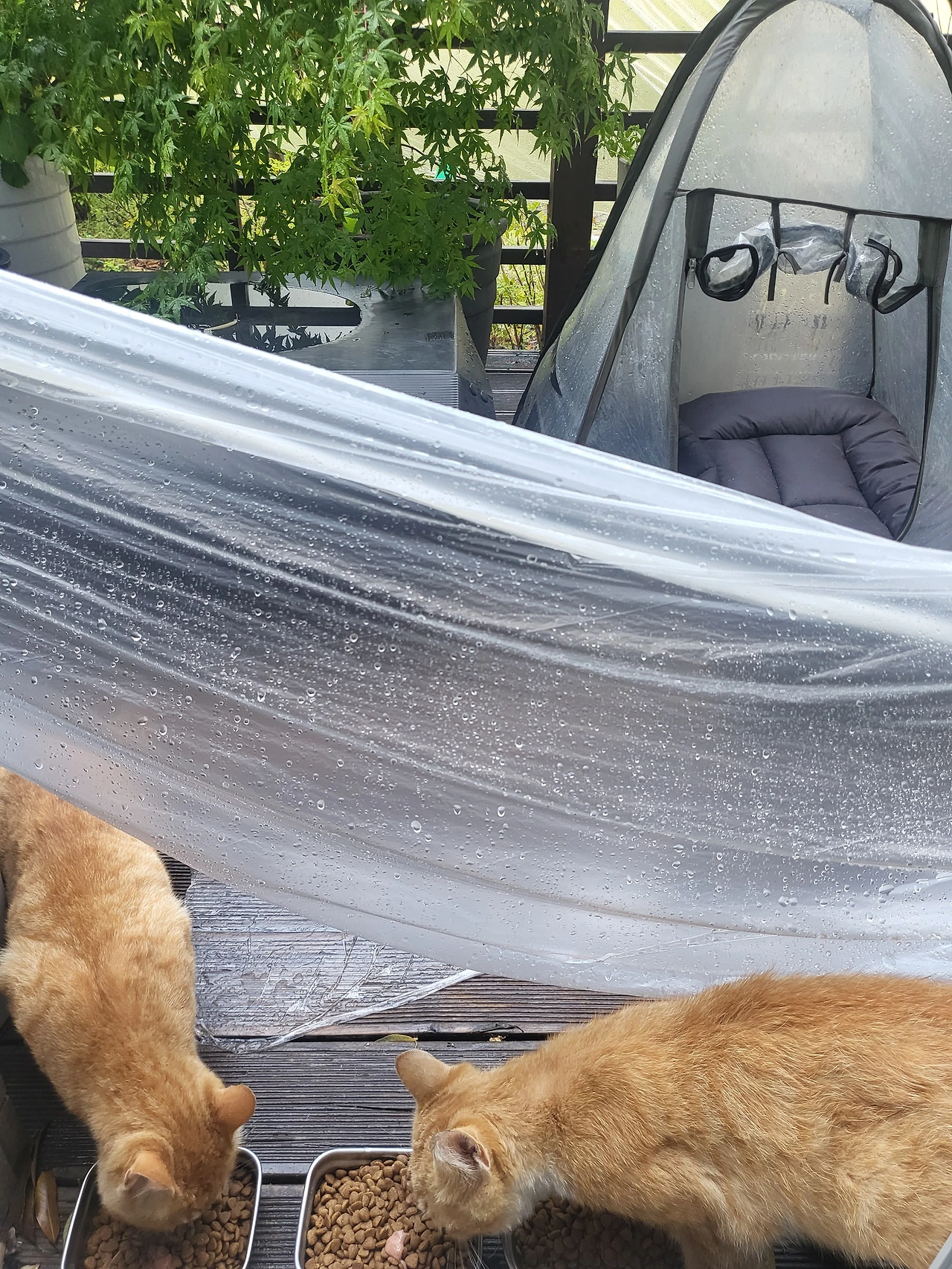 츄츄와 우유는 처음엔 비닐에 겁을 먹는 것 같았지만 요령껏 비날 아래에서 먹이를 먹거나 비를 피했다.