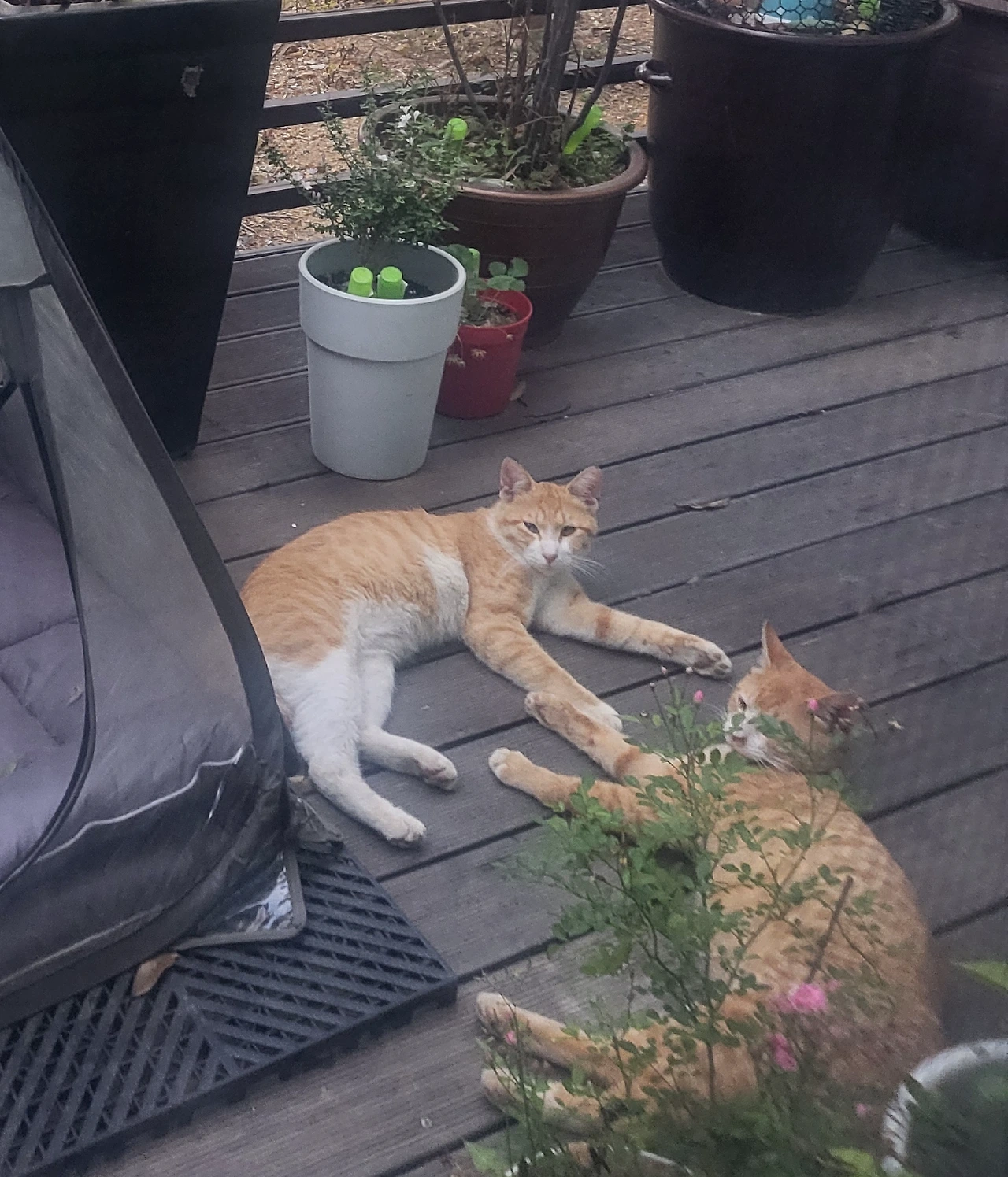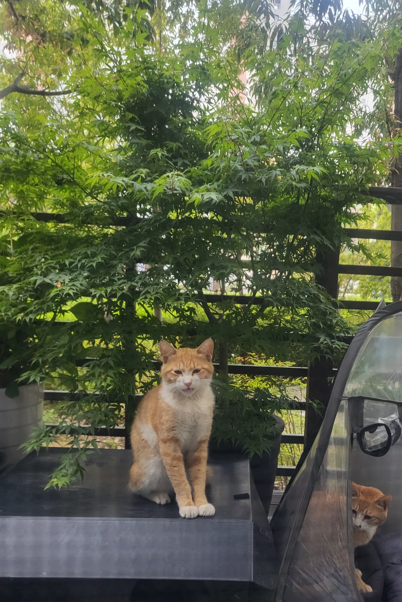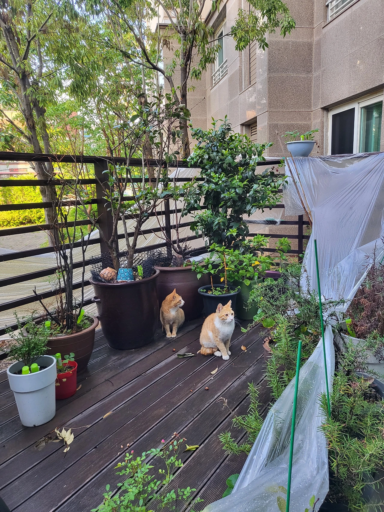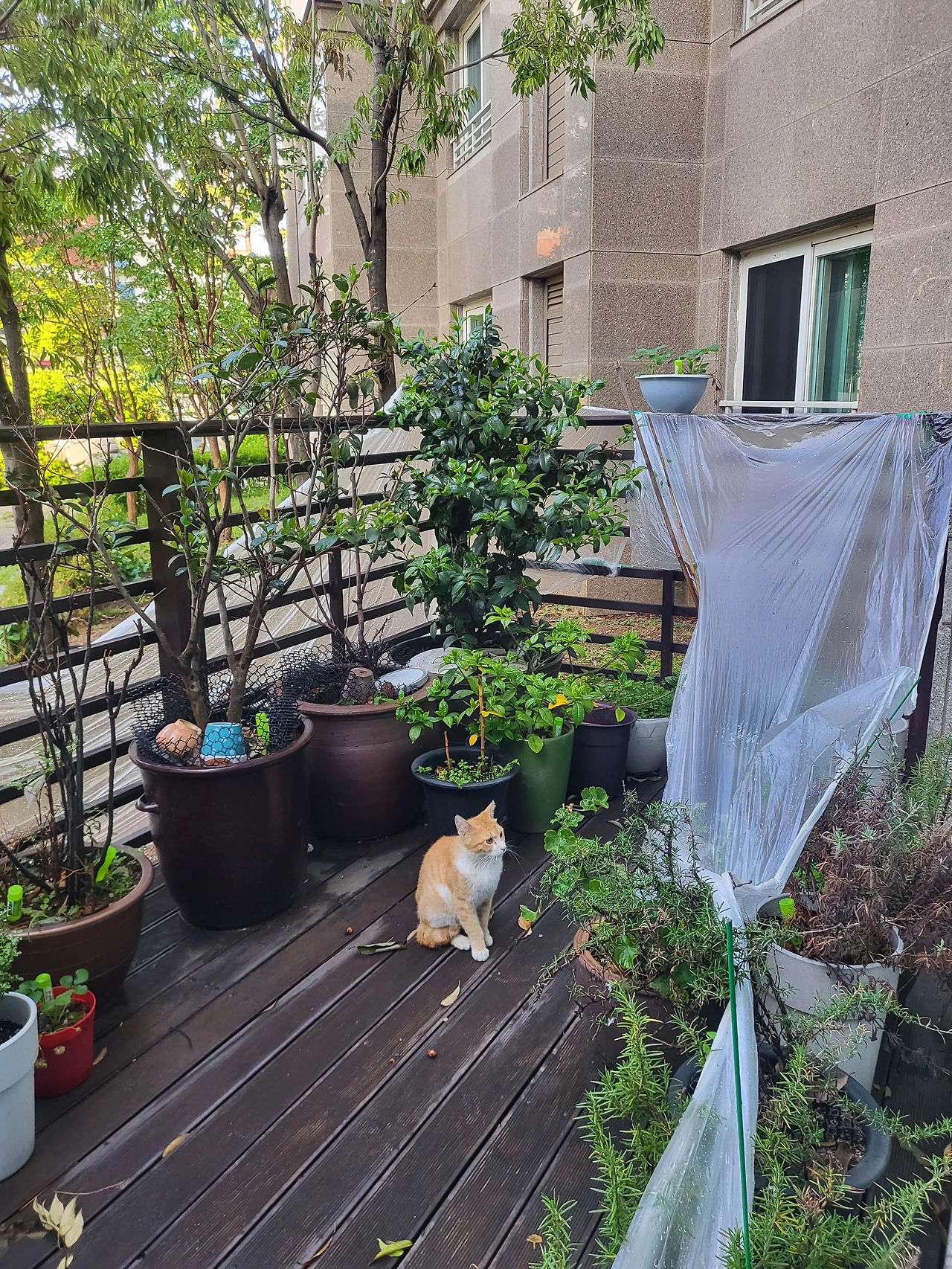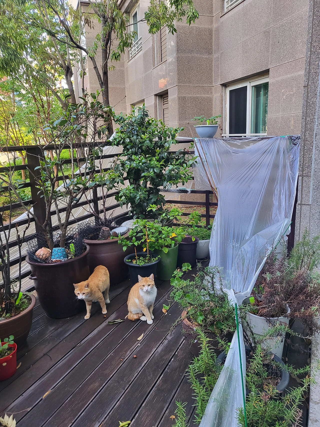 한 며칠 비닐이 있다가 사라졌다. 빗물도 다 마르고 다시 앞베란다는 원래 모습을 찾았다. 우유와 츄츄는 좀 살만한지 집 위에도 올라가고 바닥에서 배를 깔고 잠도 잤다.
