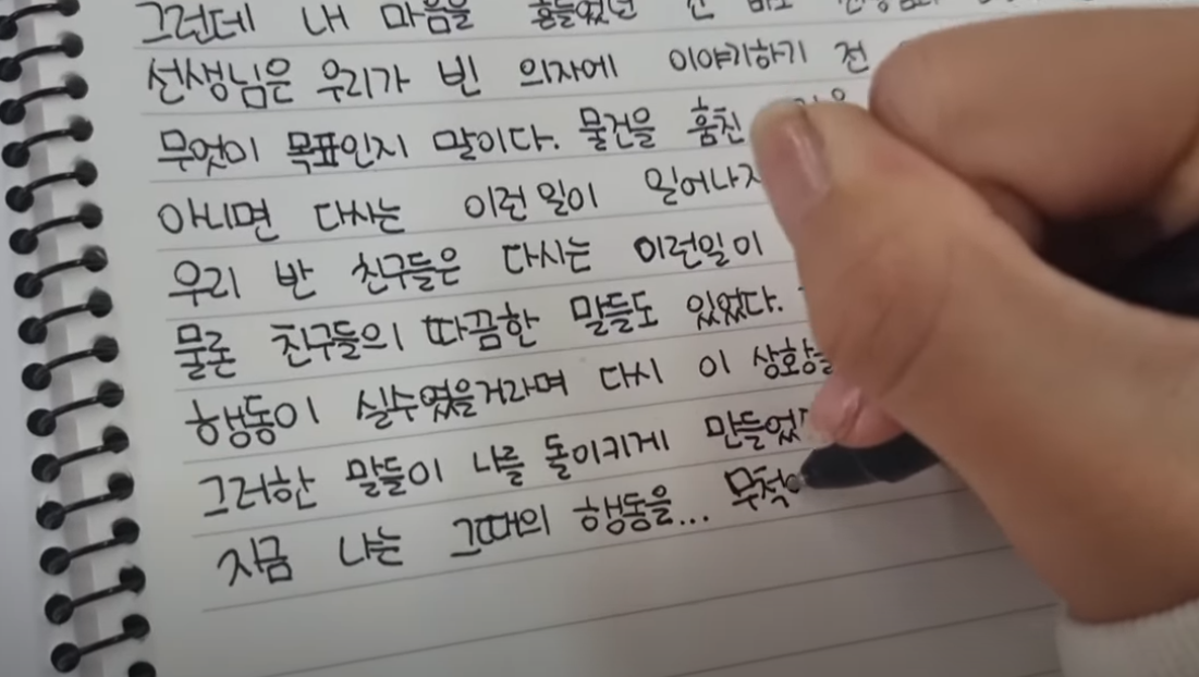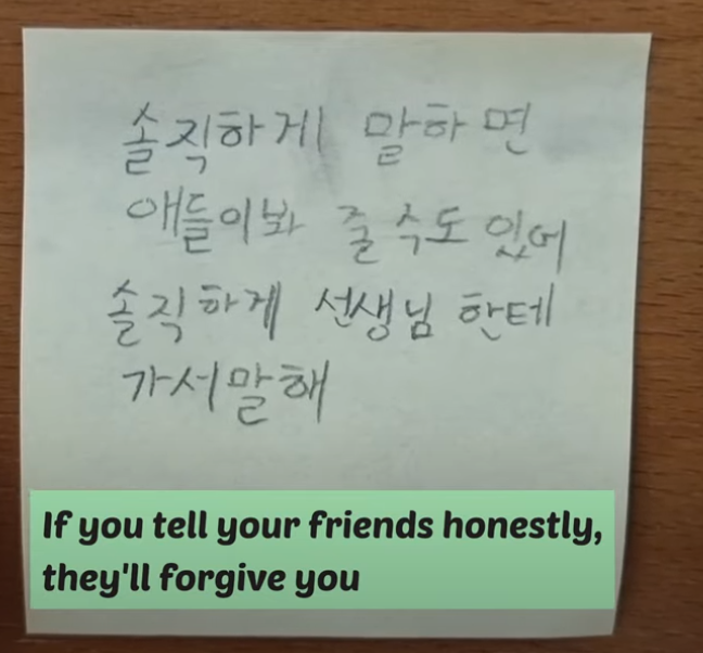 7분짜리 영화 내용 중에는 기분 나쁘게 말한 친구의 빼빼로를 가져가는 장면도 있었다. 아이들은 그 장면에서 모두 크게 웃었다. 그리고 영화 속에서 과연 누가 교실 도난 사건의 주인공일지에 대해 의견을 나누기도 했다. 영화 속에서 교실 친구들의 물건을 가져간 학생은 전혀 예상하지 못한 모범생 여자아이였다. 영화 내용 중에 선생님의 주관 하에 반 아이들이 물건을 가져간 아이에게 메시지를 보내고 붙이는 장면이 나왔다. 사실, 나 또한 아이들에게 전하고 싶은 메시지는 이런 거였다. 우리는 성장하면서 누구나 실수할 수 있어. 앞으로 그런 일 없도록 하자. 너를 믿는다.