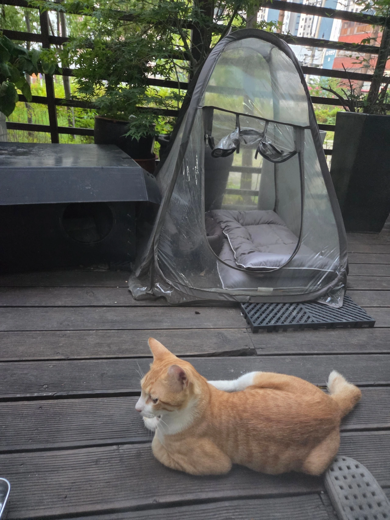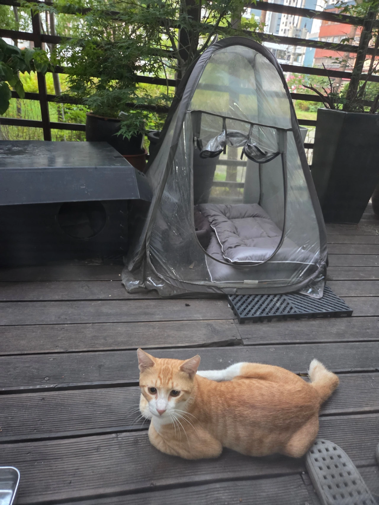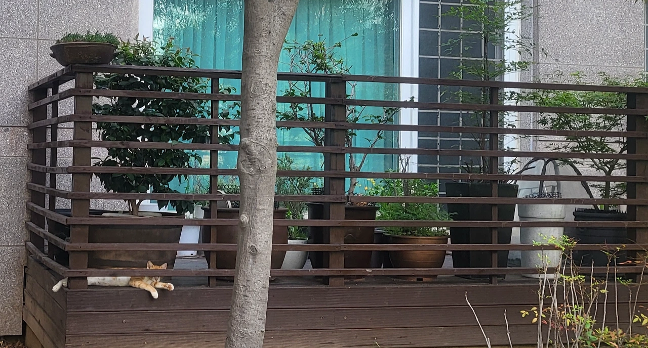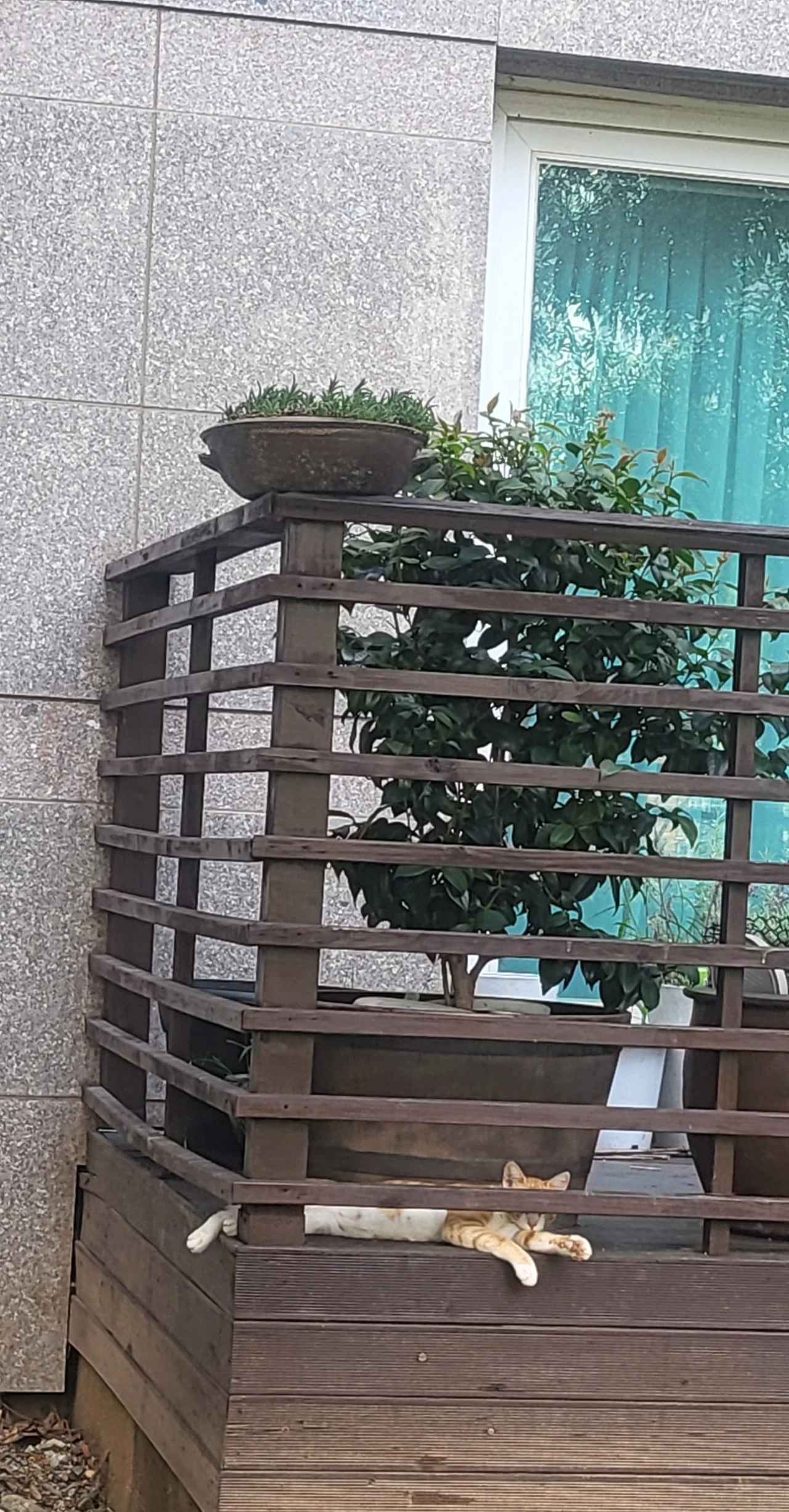 밖에 나갔다가 우유가 베란다에서 자는 모습을 봤다. 베란다 밖으로 살짝 나온 앞발과 뒷발이 귀엽다.