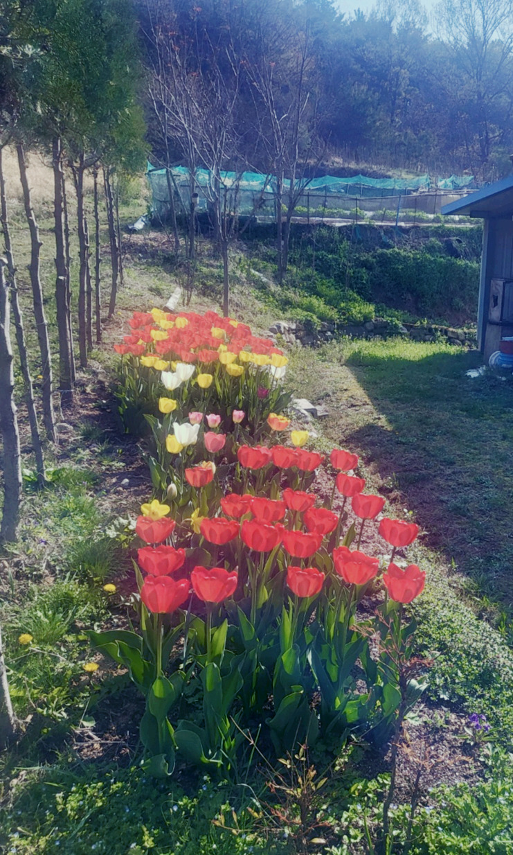 나는 남편에게 말했다. '우리 할머니 무덤에 술 한 잔 올릴까?' 남편도 좋다고 했기에 슈퍼에 들러 소주 한 병, 황태포.일회용 컵, 접시, 나무젓가락을 샀다. 그러곤 할머니 무덤으로 걸어올라갔다. 잠시 지나친 시골집들마다 튤립들이 소담스럽게 심어져 있었고 밭과 논은 일구어져 있었다. 길에는 민들레와 들풀들이 피어있었고 작은 풀벌레들과 초록색 개구리가 뛰어다니기도 했다.