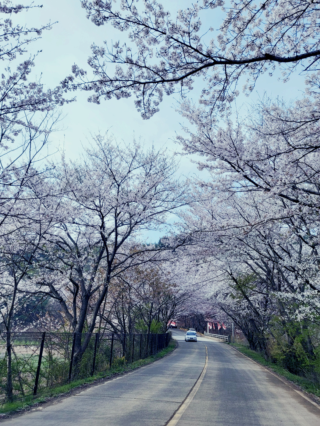 아침 일곱시, 둘째아들과 남편, 나 이렇게 세 명은 집을 나섰다. 우리가 가야할 곳은 시댁이었고 가는 길에 들르고 싶은 곳은 벚꽃길이었다. 길이 막히기 전에 벚꽃나무를 보고 싶은 욕심에 아침 일찍 집을 나왔던 것이다. 벚꽃나무는 길의 끝이 안 보이게 줄을 지어 있었다. 때를 만난 벚꽃은 나무 사이사이 빈틈없이 피어 있었다. 게다가 바람이 불면 흩날리기까지 해서 봄의 낭만을 느끼게 했다.