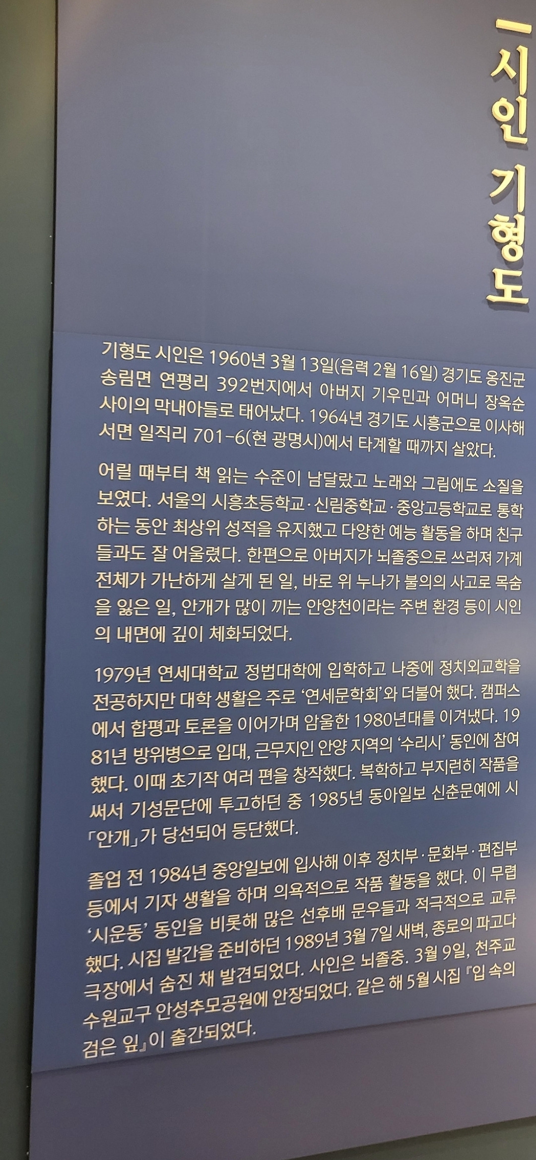 그 시인의 흔적을 혼자 찾아갔다. 광명역에서 내려 버스 두 코스만 가면 있는 곳. 길가에 있어서 찾기도 쉬웠다. 시인을 안지 이십 년이 넘었기에 오랜 친구를 만나는 기분이었다. 조촐하고 담백한 시인의 집 입구에서시인은 웃고 있었다. 내가 좋아하는 빈집이라는 시가 시인의 사진 옆에 적혀 있었다. 시인의 시로 가득한 집은 더이상 비어있지 않은데 말이다.