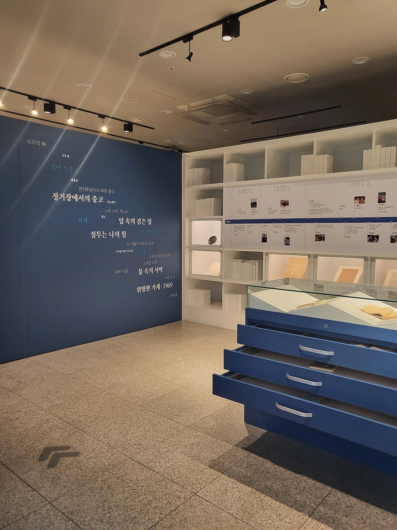 여러겹의 서랍들이 인상적이었다. 벽에는 시인이 쓴 시의 제목들이 흩어져 있고 시인의 이력들이 적혀 있었다.