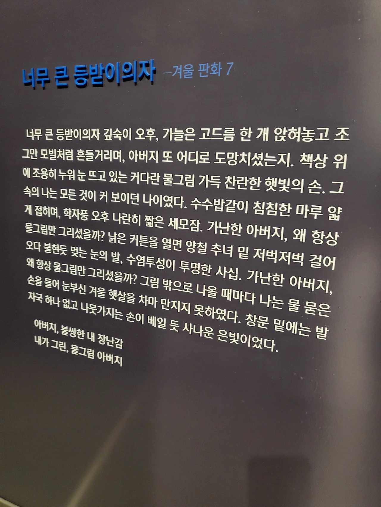 방안에서 창문 밖을 보는 듯한 느낌이 드는 공간도 마음에 들었다. 시인은 방안에서 엄마를 기다리며 도시 저편으로 사라지는 해들을 무수히 보았을 것이다. 오랜만에 시인의 시를 실컷 읽으며 시 속에 빠져드는 기분이었다.