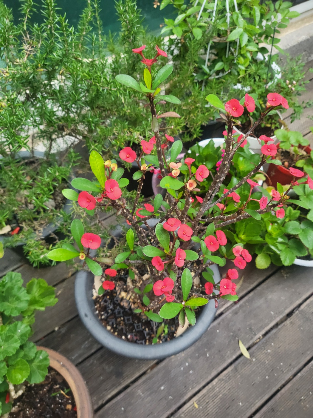 가시가 없는 꽃기린. 겨울 내내 실내에 두었더니 잎도 다 떨구고 힘들어했다. 저러다가 죽으면 어쩌나 걱정했는데 봄에 야외에 나온 뒤부터 기운을 회복하고 꽃을 피웠다.