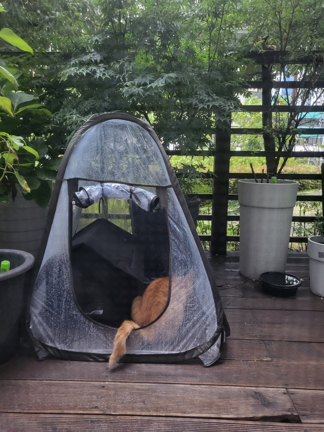 주문한 물품이 온 날, 플라스틱 발판을 놓은 뒤 그 위에 미니집을 올렸다. 미니집 안에는 쿨매트도 깔았다. 그리고 미니집이 들어갈 수 있는 크기의 비닐 하우스도 설치하고 집 옆에 사료도 놓았다. 나는 비가 오는 날만 기다렸다. 비가 오면 치즈가 사료도 먹고 비를 피하기 위해 미니집안에 들어갈 수도 있겠다는 기대를 했다.