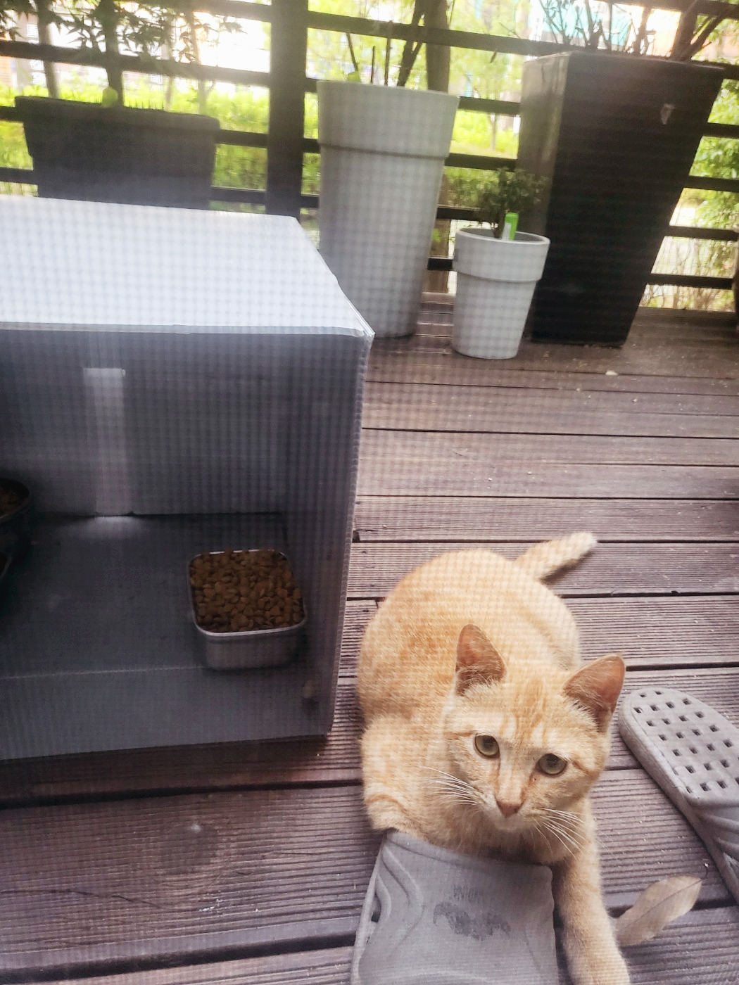 길고양이 치즈는 나무 데크에 둔 먹이를 먹으러 왔다. 나는 외출할 때 먹이를 놓아두고 갔다. 가장 골치아픈 건 비가 올 때였다. 먹이가 밥그릇에 있는데 비가 와 버리면 사료는 물에 퉁퉁 불어버렸다. 할 수 없이 치즈가 비를 피하며 먹이를 먹을 수 있는 플라스틱 상자를 샀다.