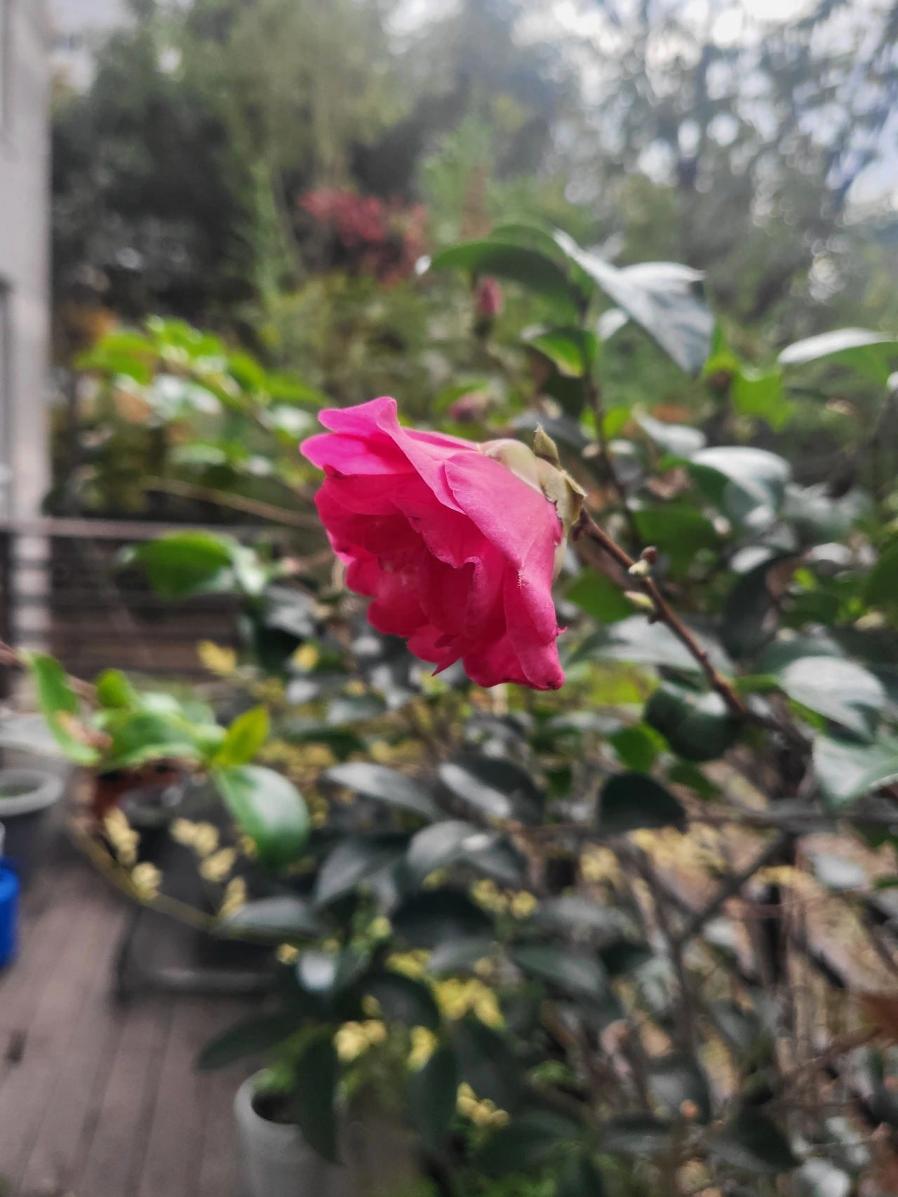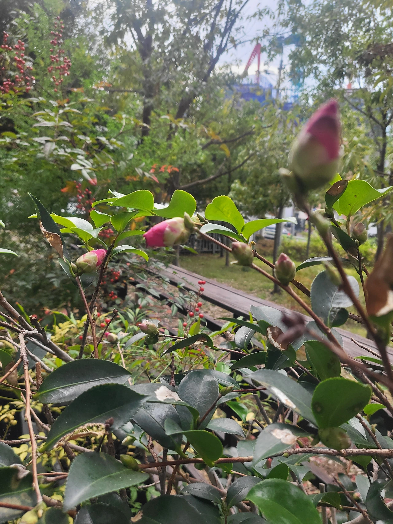 이런 나에게도 가을국화가 찾아왔다. 이름은 모르겠다. 그냥 국화라는 정도만 안다. 게다가 장미도 나를 놀라게 했다. 봄에는 노란장미를 피우더니 가을에는 같은 줄기에 진분홍장미 봉우리가 맺혔다. 동백꽃도 벌써 핀다. 로즈마리는 연보라빛깔 꽃을 피운다.