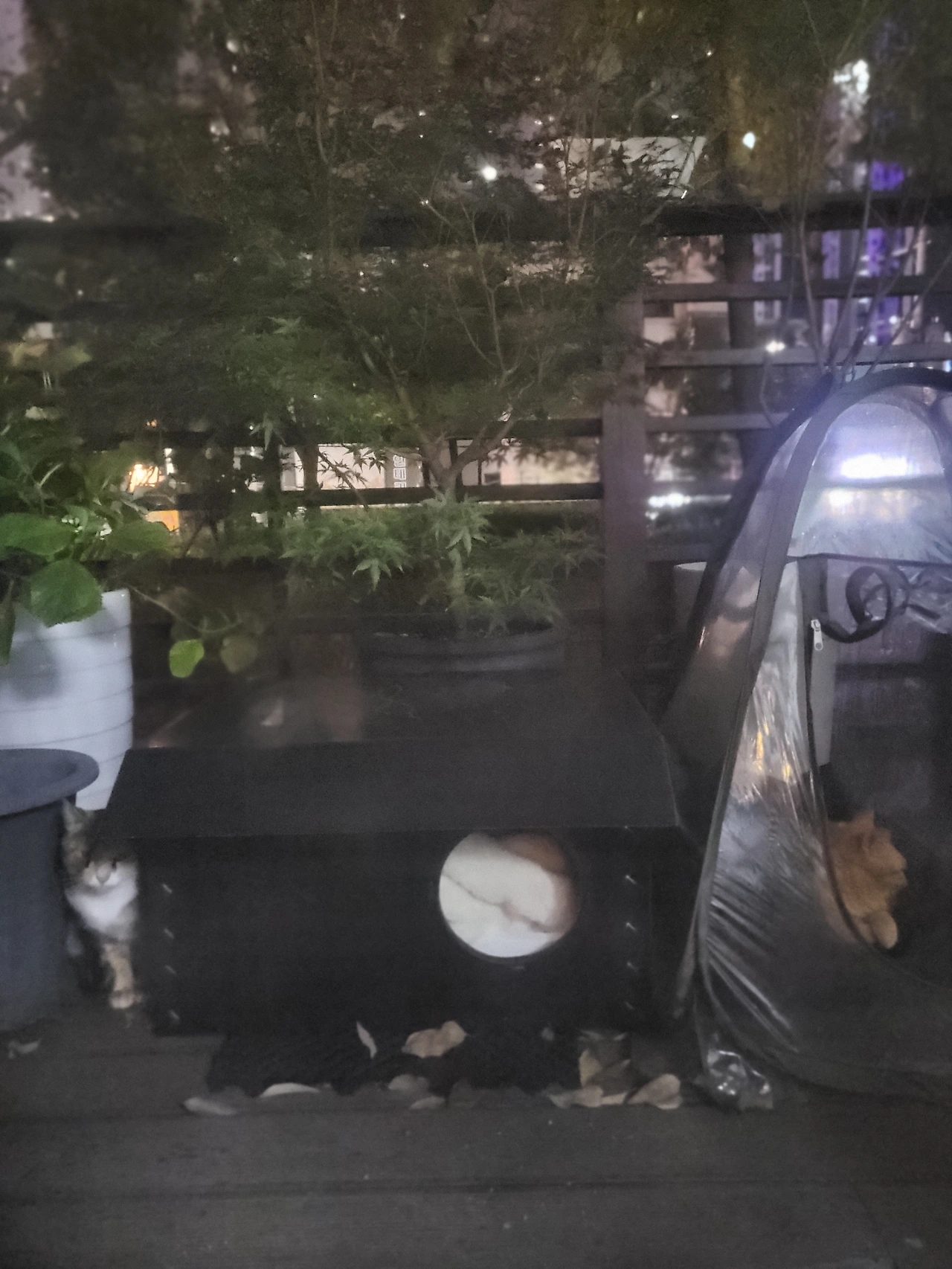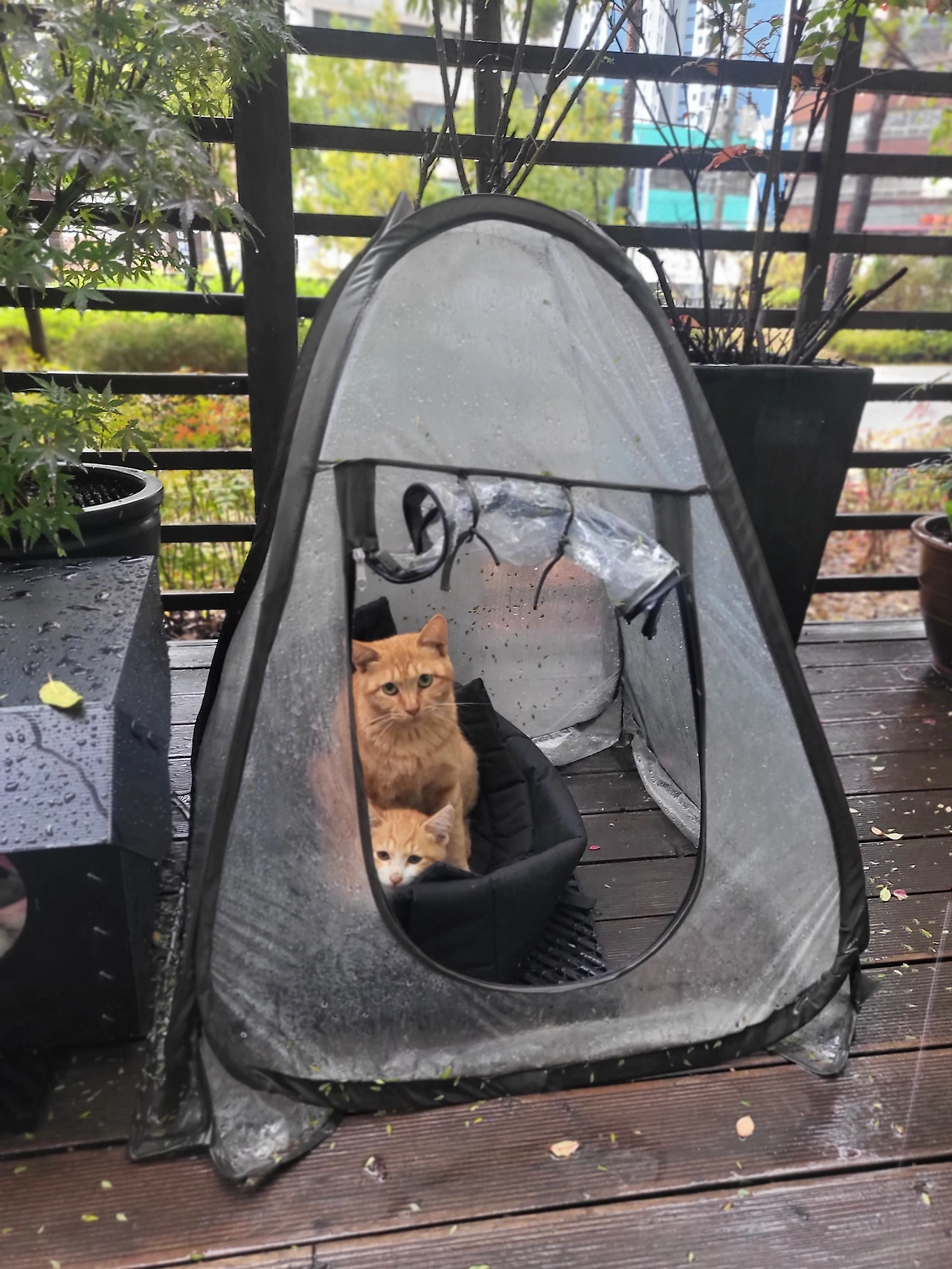 밤새 비가 왔고 바람이 불어 나뭇잎들이 떨어졌다. 아침에 나무베란다를 내다보니 치즈와 우유는 그대로 자고 있었다.