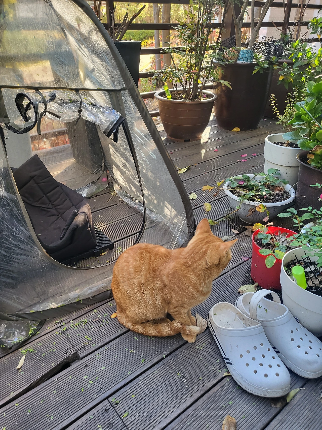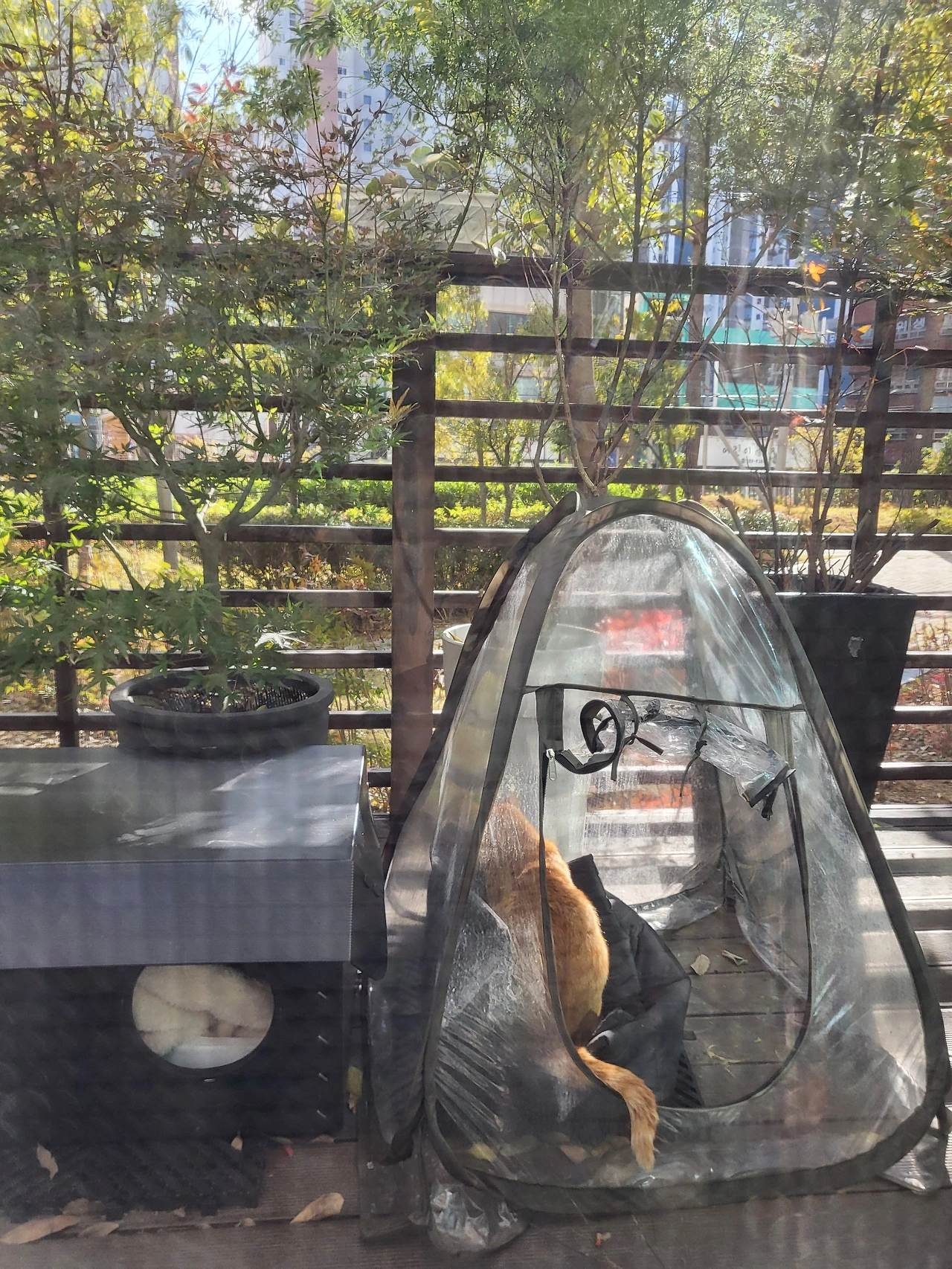 치즈는 한낮에 햇살을 받으며 비닐집을 지키고 있다. 늘어지게 낮잠을 자기도 했다. 나는 치즈를 방해할까봐 베란다도 치우지 않았다. 나뭇잎들이 마구 엉켜있었지만 치즈는 그 사이에서도 평화로워 보였다.