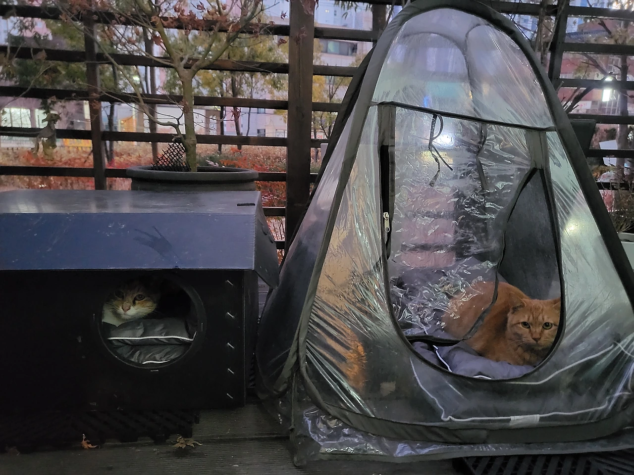 밤이 되면 치즈는 푹신한 방석이 있던 비닐집에서 쫓겨나 검은 집으로 갔다. 나는 검은 집안에도 같은 방석을 넣어두었다. 나비에게 번번히 쫓겨나는 치즈가 안쓰러웠다.