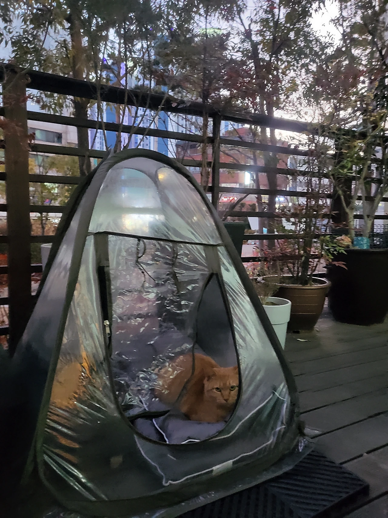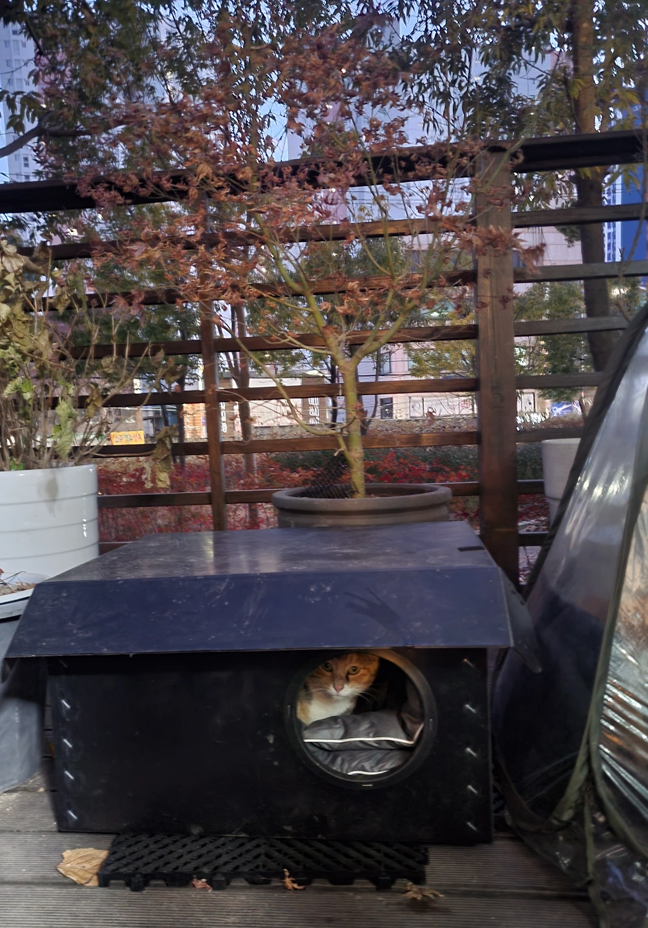 새 방석을 넣어 준 저녁, 치즈가 잘자는지 궁금해서 베란다 문을 열어보았다. 하지만 검은 집에서 내다보는 얼굴은 순둥이 치즈가 아닌 것 같았다.