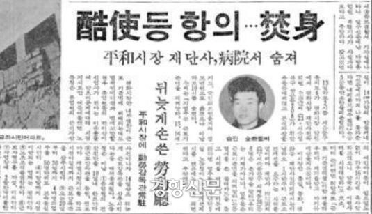 1970년 10월에는 본격적으로 근로조건 시위를 주도하였다. 11월 근로기준법 화형식과 함께 평화시장 입구에서 온 몸에 휘발유를 끼얹고 친구 김개남(가명)에게 자기 몸에 성냥 불을 그어 달라고 했고, 친구는 그의 몸에 불을 붙였다. 그는 온 몸에 불이 붙은채 평화시장을 뛰었지만 방치되다가 쓰러졌으며 이후 병원에 도착한 뒤에도 주사 비용이 필요하여 근로감독관의 보증이 필요하다 했지만, 근로감독관은 보증을 거부했고, 다시 옮겨진 성모병원에서는 가망이 없다는 이유로 그를 3~4시간 방치되다가 사망하였다.