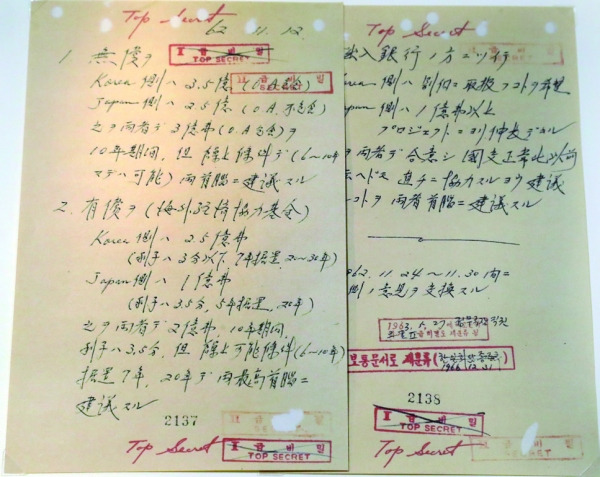 1961년 11월 22일 박정희는 일본을 방문하여 이케다를 만나 "맨주먹으로 황폐한 조국을 이끌어 보겠다는 의욕만은 왕성하다"며 협조를 요청했다. 1962년 중앙정보부장 김종필은 외무장관 오히라 마사요시를 만나 협상의 내용을 합의하였다. 이 협상 내용은 "김-오히라 메모"로 불린다. 그리고 협의된 내용은 아래와 같다.