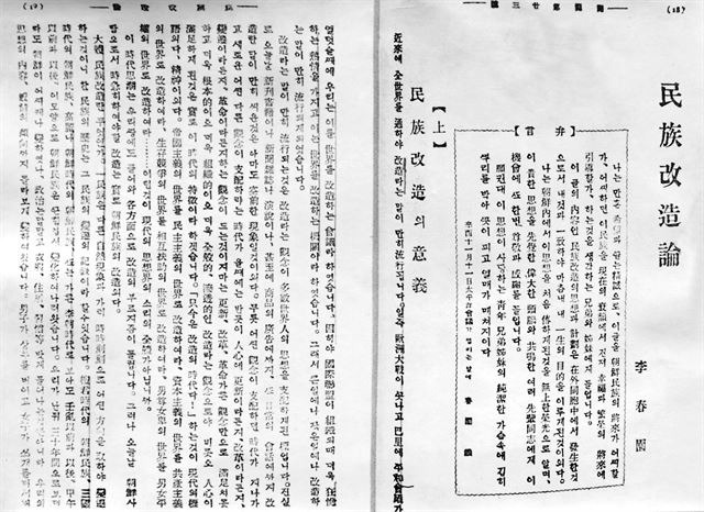 -. 그의 변절의 시작이라고 보는 ‘개벽’에 실린 민족개조론에서 그가 본 조선민족성은 ‘허위되고 공상과 공론만 즐겨 나태하고 서로 신의와 충성이 없고, 일에 임하여 용기가 없고, 빈궁하고’ 등으로 보았다.