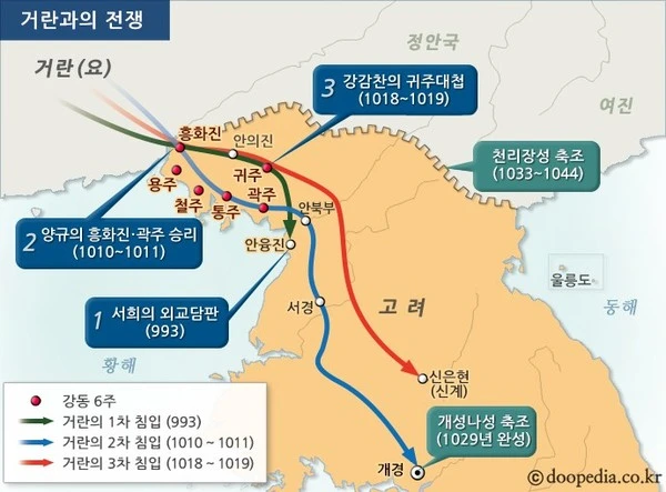 993년(성종 12) 1차 침입에서는 소손녕이 이끈 거란군에게 승리한 뒤 서희가 담판을 벌여 강동 6주를 획득하였고, 1010년(현종 1) 2차 침입에서는 강조의 정변을 구실로 침공해 왔으나 별 소득없이 돌아갔다.