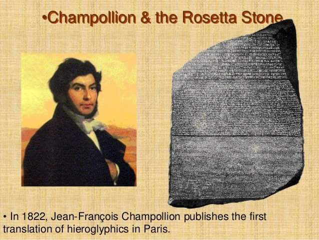 1814년 영국인 토마스 영이 이집트 민중문자의 해독을 끝냈고, 이집트 상형문자 해석을 시작했다. 1822년부터 1824년까지 장프랑수아 샹폴리옹이 이 일을 확장하여, 로제타 돌을 해석하였다. 샹폴리옹은 그리스어와 콥트어를 읽을 수 있었으므로 그것부터 해석하였고, 테두리가 둘러진 것이 무엇인가를 알아냈다. 그렇게하여 이집트 상형문자를 해독할 수 있는 길이 열렸다.