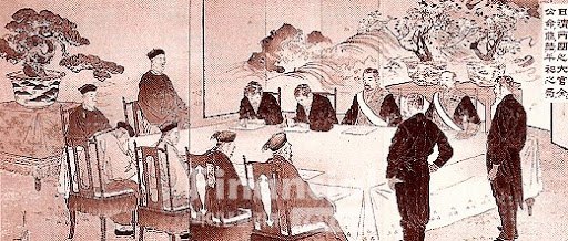 변법개화파가 일본 공사관과 내통하여 1884년 갑신정변을 일으켜 정권을 잡았으나, 3일만에 청나라 군사고문 원세개의 개입으로 반란은 진압되었다. 청나라와 일본은 사태를 수습하기 위해 이듬해 1885년 톈진 조약을 체결하였다.