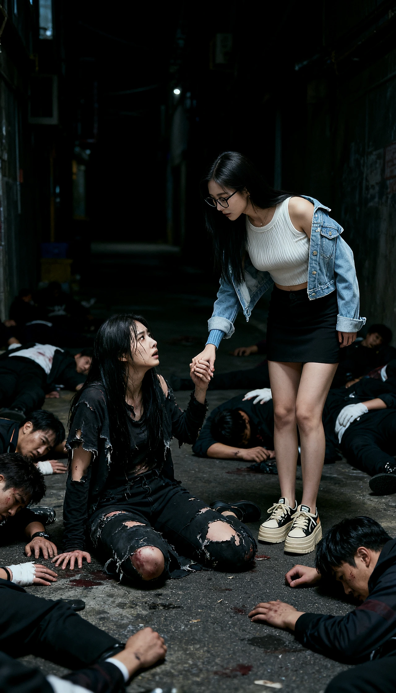 싸움이 끝난 후, 여왕은 피투성이가 된 채 거친 숨을 몰아쉬며 바닥에 앉아 있었다. 그리고 그때, 골목에 숨어 있던 서윤이 모습을 드러냈다.