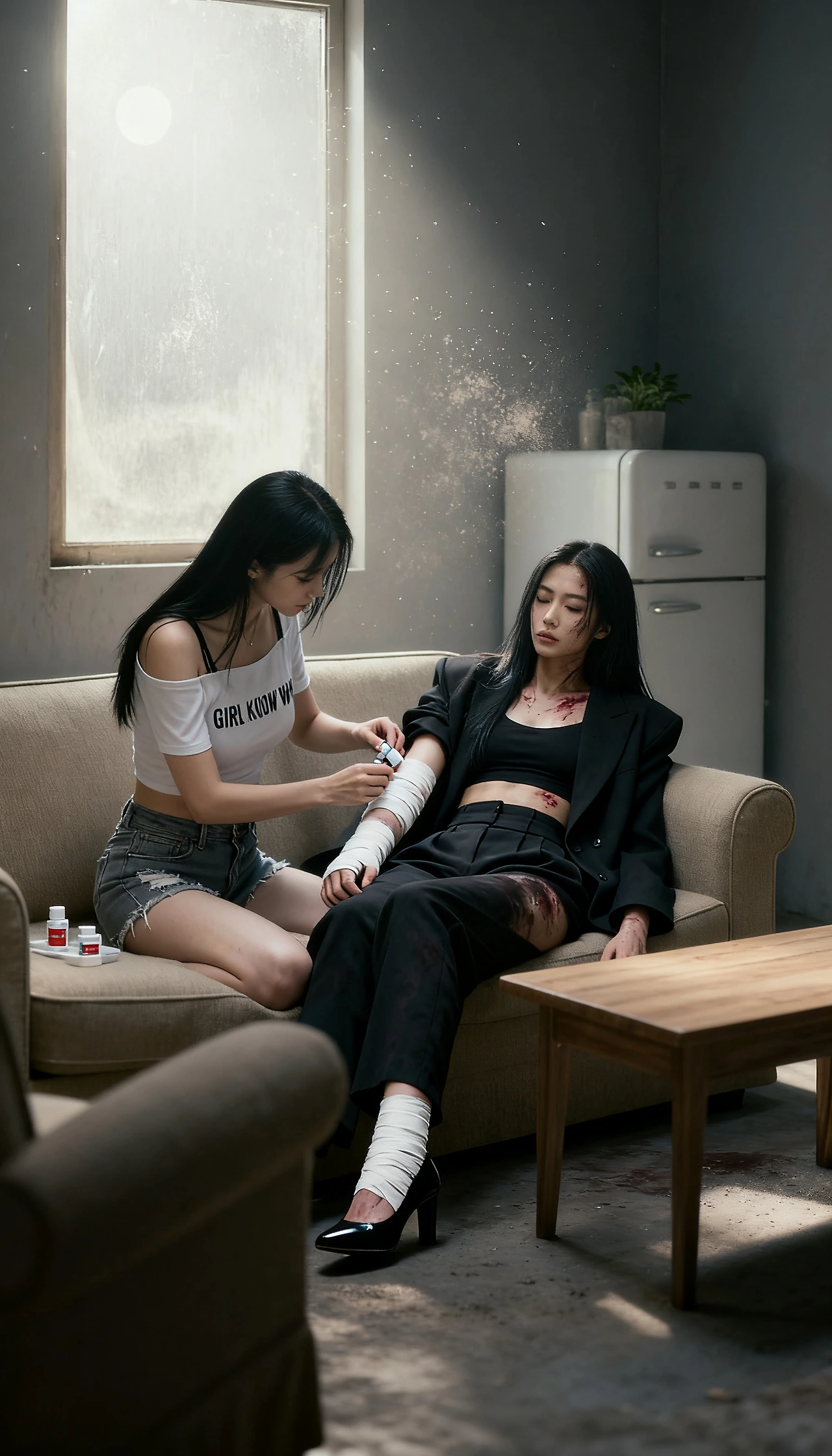 어느 날 밤, 여왕은 깊은 상처를 입은 채 돌아왔다. 그녀는 바닥에 주저앉았고, 서윤은 재빨리 응급 상자를 들고 다가갔다. 서윤은 피로 물든 여왕의 손을 잡고 상처를 치료하기 시작했다. 여왕의 손에는 피 냄새와 함께, 방금 전까지 휘둘렀을 폭력의 흔적이 선명했다.
