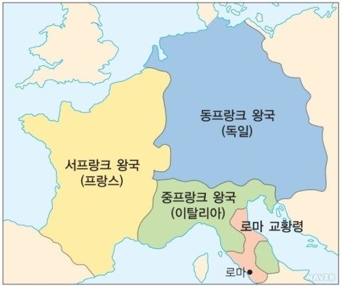 피핀3세의 아들이 중세 유럽사회에서 가장 유명한 황제였던 카롤루스 대제다. 그는 교황으로부터 로마제국 황제의 칭호를 받아 신성로마제국의 시초를 만든다. 그의 아들이 경건왕 루트비히 1세인데 그의 사후 당연히 장남이었던 로타르가 승계하고자 하였으나 동생들인 루트비히, 샤를의 저항에 부딪히며 베르됭에서 조약을 맺어 나라가 3분할되니 동프랑크(독일 지방), 중프랑크(이탈리아 지방),서프랑크(프랑스 지방)가 된다.
