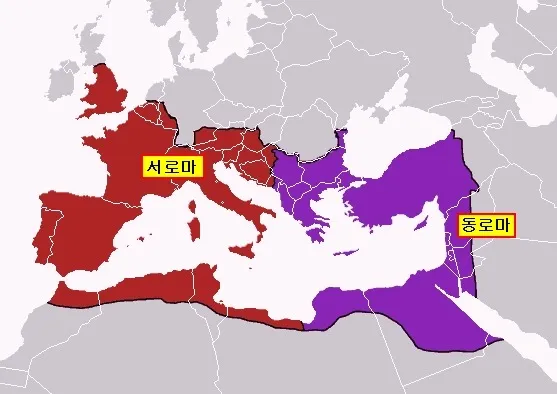 로마는 테오도시우스 황제때 제국을 동서로 분할하여 아들들에게 통치를 맡겼는데 이때 동부를 동로마, 서부를 서로마라 부르며 분열되기에 이른다.