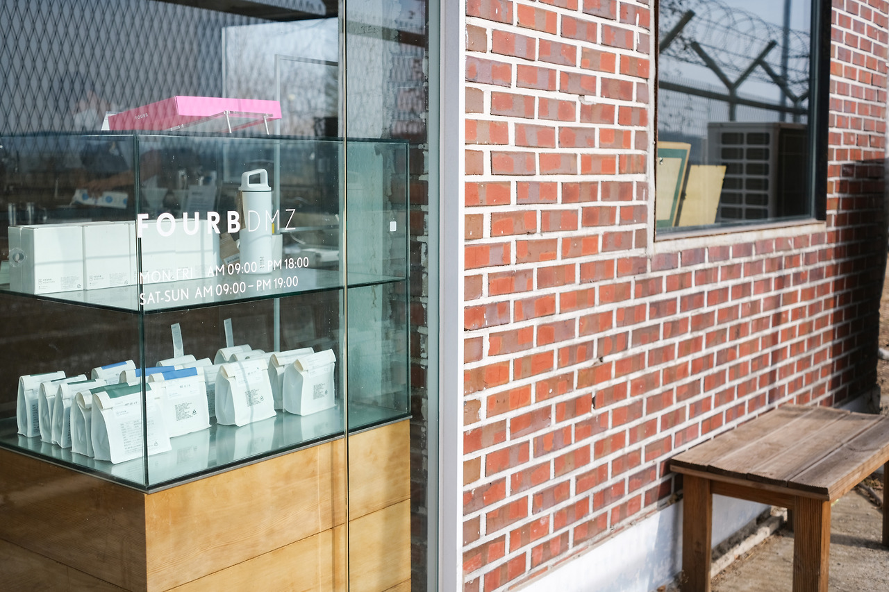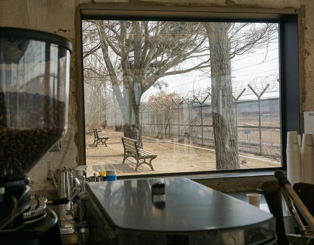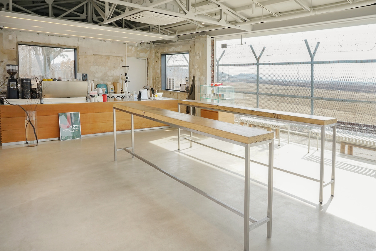 포비 DMZ는 바가 있는 안쪽 면을 제외한 모든 면이 유리로 되어있다. 유리로 된 간이 휴게소와 같은 느낌이랄까? 외부에서 보면 미국의 건축가 필립 존슨의 ‘글래스 하우스’를 떠올리게 한다. 심플하고 깔끔한 인상을 주는 포비 DMZ는 공간이 작은 만큼 내부에 앉아서 쉴 만한 자리가 많지 않다. 이 머나먼 곳까지 왔으니, 이왕이면 답답한 실내보다는 카페 외부에 여유 있게 마련된 벤치를 이용하시라는 배려일지도 모른다.