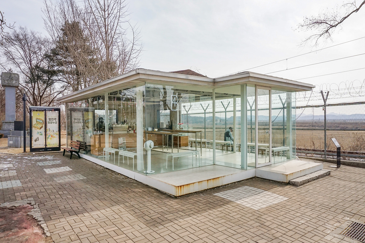 이번에 방문한 포비 DMZ는 임진각 평화누리공원 안에 ‘숨겨져’ 있다. 문자 그대로 정말 숨겨진 카페다. 면적 넓은 파주 관광지답게 공원도 꽤나 큰데, 널찍한 주차장을 지나고 평화의 종과 망배단이 있는 언덕 너머로 가야 한다. 그곳에서도 안쪽으로 깊숙한 곳에 포비 DMZ가 있다. 공원 안쪽으로 깊고 긴 곳에 숨겨진 것 치고는 꽤나 단출하다. 3면이 유리로 되어 있는 자그마한 건물이 전부. 따로 2층도 없고 지하도 없다.