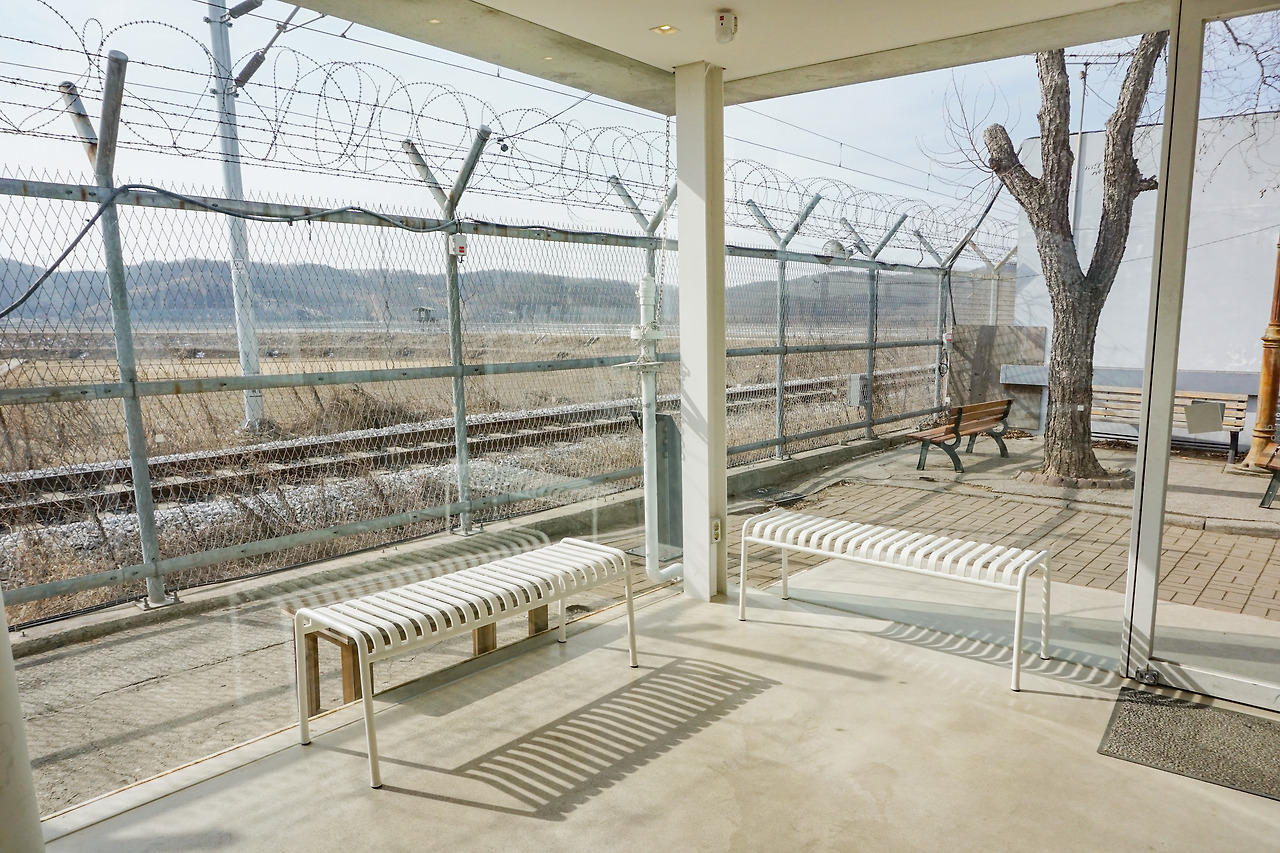 5월 중순의 맑고 쾌청한 날씨는 자연스럽게 야외의 벤치로 발길을 이끈다. 건물 옆면으로 임진강이 내다보이는 철책이 있고, 철망 너머를 바라보며 앉아 쉴 수 있는 벤치가 많다. 꼭 철책 뷰가 아니더라도 휴식을 취할 수 있는 곳은 많다. 공원에서도 외진 곳까지 찾는 이가 그렇게 많지도 않으므로 자리를 걱정할 필요는 없다.