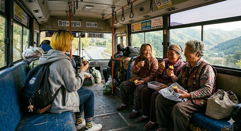 버스 안은 시골 장터 분위기였다. 보자기에 닭을 안고 가시는 할매, 박스째 짐을 쌓아 놓고 방언으로 한바탕 이야기 중이신 할매. 나는 맨 뒷자리 구석에 조용히 끼어 앉았다.