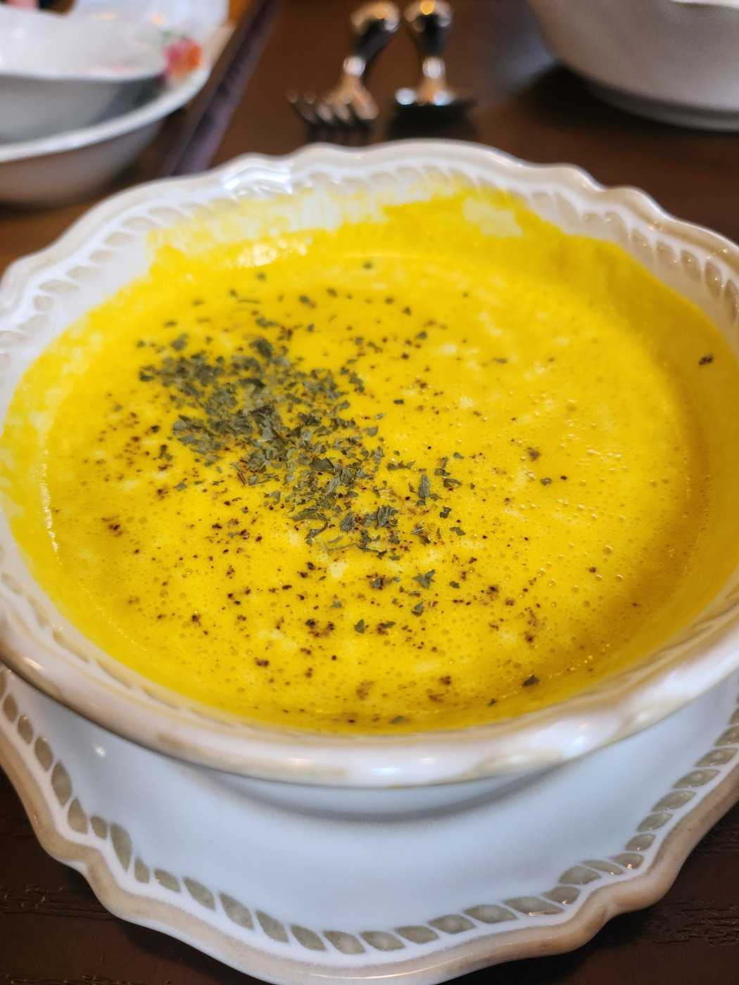얼마 전에 집 근처 새로 생긴 샐러드집에서 먹은 단호박수프입니다.