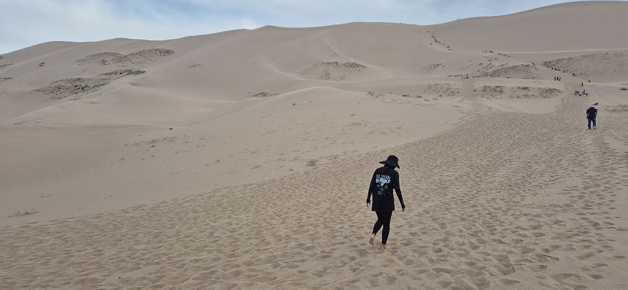 이곳을 보기 위해 3일을 쉬지 않고 달려왔다. 중국이 몽골을 침략할 수 없던 지리적 힘, 고비사막이 눈앞에 있었다. 이미 허리와 어깨, 목은 남의 것인 양 거북하고 손발 저림 현상도 나타나고 있었으나 나는 조용히 고비 사막의 한가운데 능선을 따라 올라갔다.