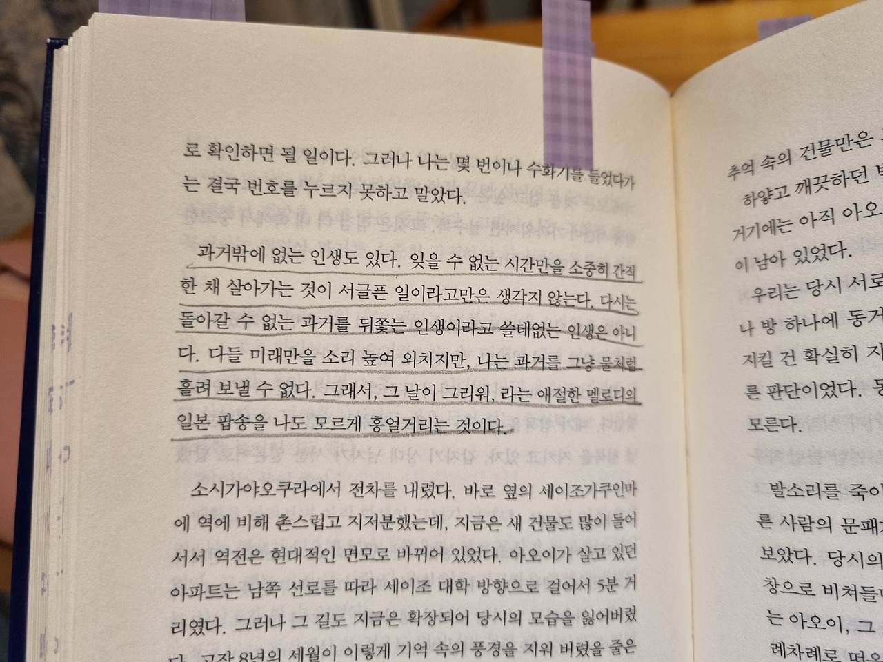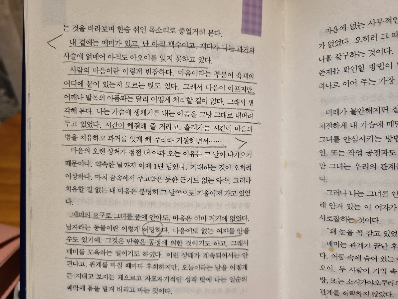 '사람의 마음이란 이렇게 번잡하다. 마음이라는 부분이 육체의 어디에 붙어있는지 모르는 탓도 있다. 그래서 마음이 아프지만, 어깨나 발목의 아픔과는 달리 어떻게 처리할 길이 없다. 그래서 생각해 본다. 나는 가슴에 생채기를 내는 아픔을 그냥 그대로 내버려 두고 있었다. 시간이 해결해 줄 거라고, 흘러가는 시간이 마음의 병을 치유하고 과거를 잊게 해 주리라 기원하면서........'