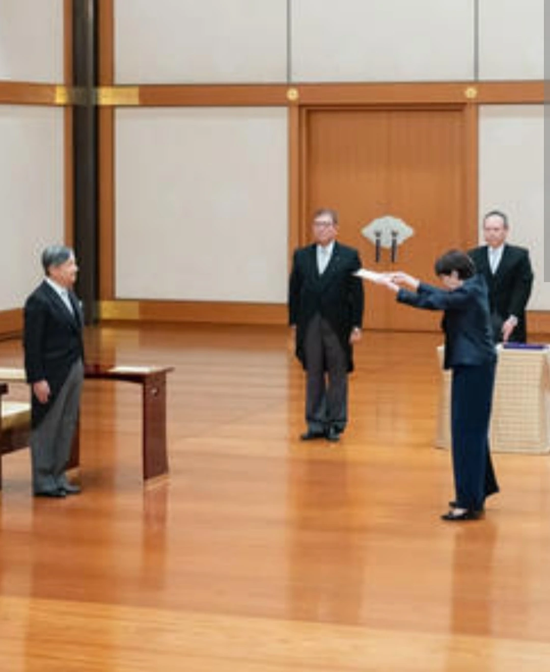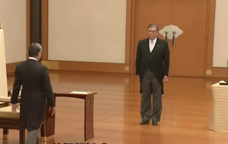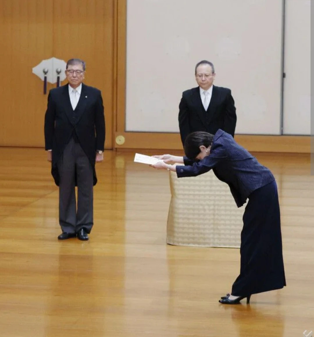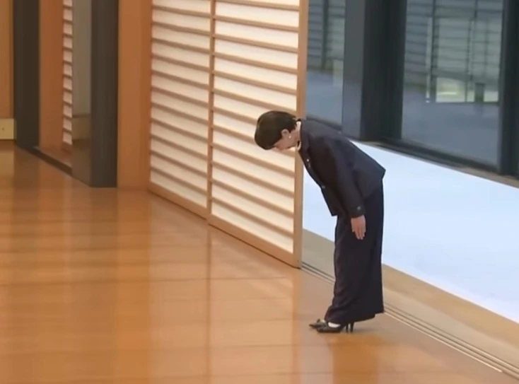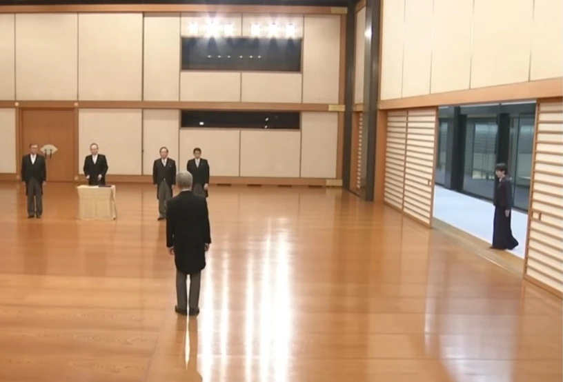 입구에서부터 들어와 임명장을 시관에게 받고 천황 앞에서 90도 꺾어 절하고 뒷걸음치고 나갈 때까지 11번을 절한다.
