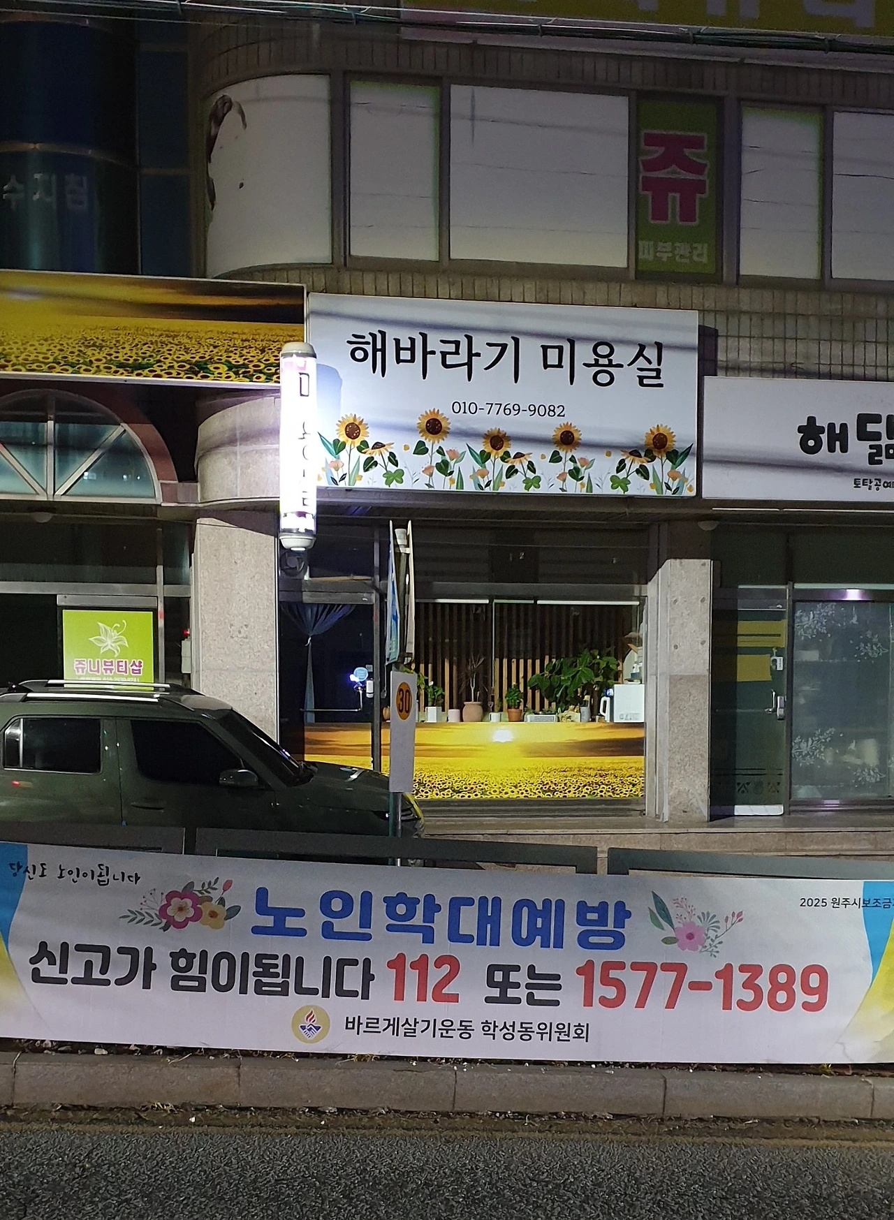 지방도시의 하필 초등학교 입구에 걸린 현수막