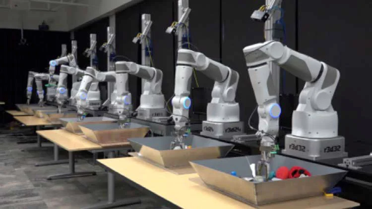 사진처럼 여러 대의 로봇을 동시에 활용해 학습 속도를 높이는 방법도 있지만, 물리적인 움직임 자체에는 시간이 필요하기에 한계가 존재합니다. 그에 비해 시뮬레이션 환경에서는 훨씬 빠른 속도로, 다양한 조건을 반복 실험할 수 있습니다.