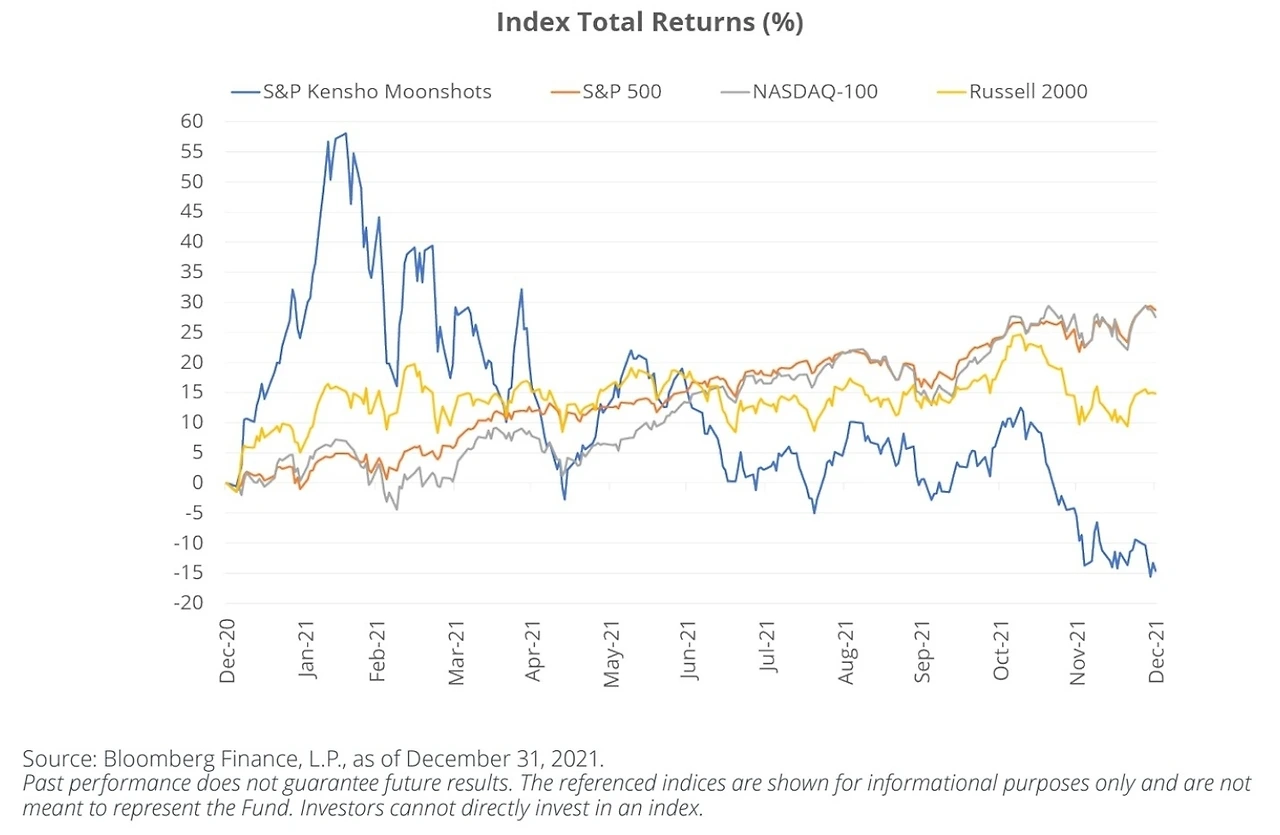연구를 하는 사람들은 한 번쯤 혁신을 지향하는 문샷 프로젝트를 꿈꾸다 점차 현실과 타협하게 됩니다. 그만큼 성공 확률이 낮지만 성과가 크기에 듣기만 해도 설레는 단어가 아닐까 싶습니다. 2021년 팬데믹으로 기술주가 폭등하고 기대감이 충만하던 때, 2020년 말 등장했던 Moonshot Innovators ETF(티커 MOON)은 압도적인 성과를 기록했습니다. S&P Kensho Moonshots 인덱스를 추종하는 상품이었는데, 이 인덱스는 AI 분석을 통해 혁신 성향의 기업들을 자동으로 선정하는 것이 방식입니다. 이름 그대로 미래 테마지만 초기 상태인 기술 기업들로, 최근의 예로는 로켓랩 (Rocket lab) 같은 기업입니다. 주가 추이는 예상했듯이 21년 초 정점을 끝으로 거품이 사라졌고 유례없는 금리 인상기 중소형 기술주의 폭락과 함께 달나라 여행은 불발되었습니다.