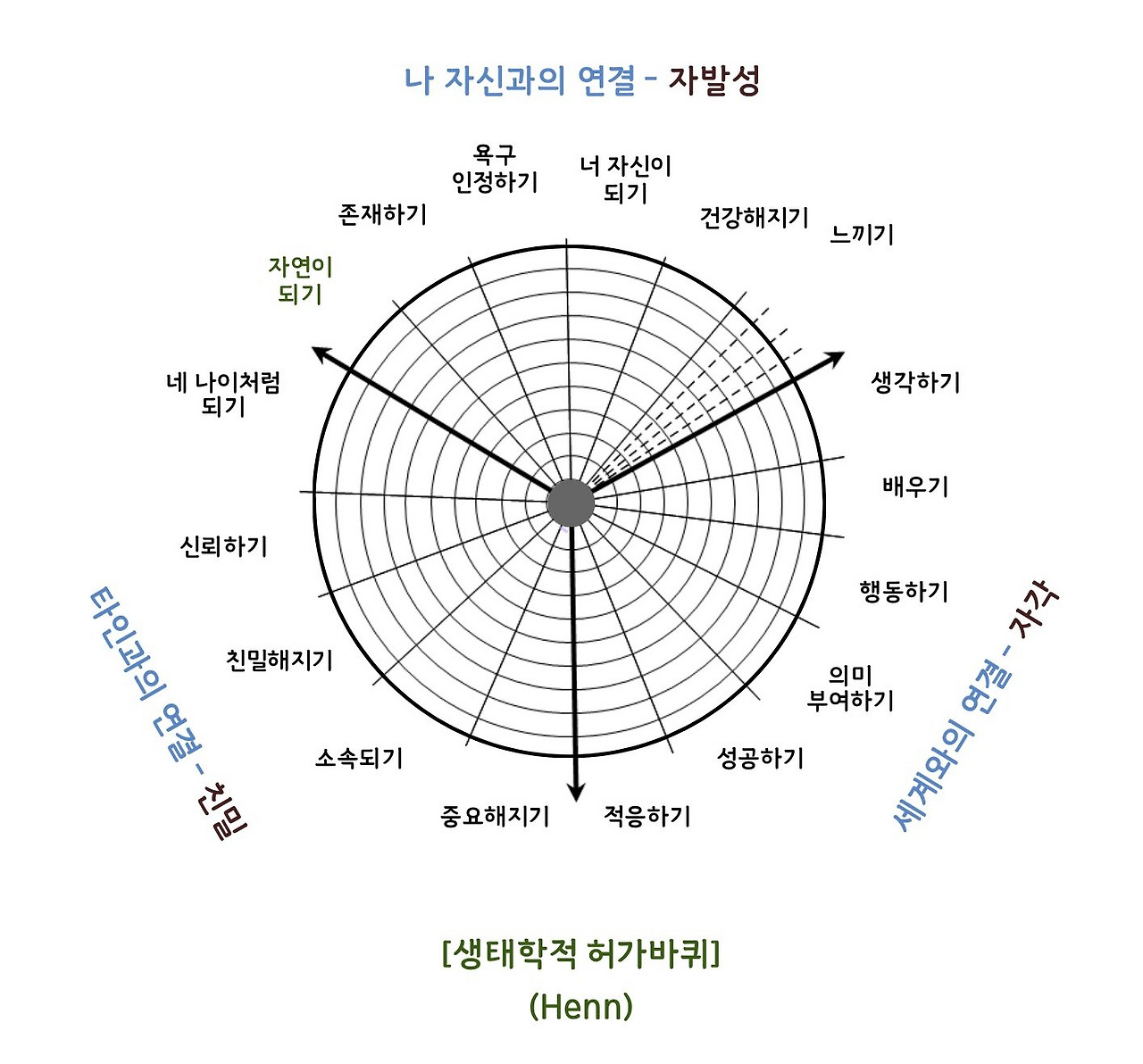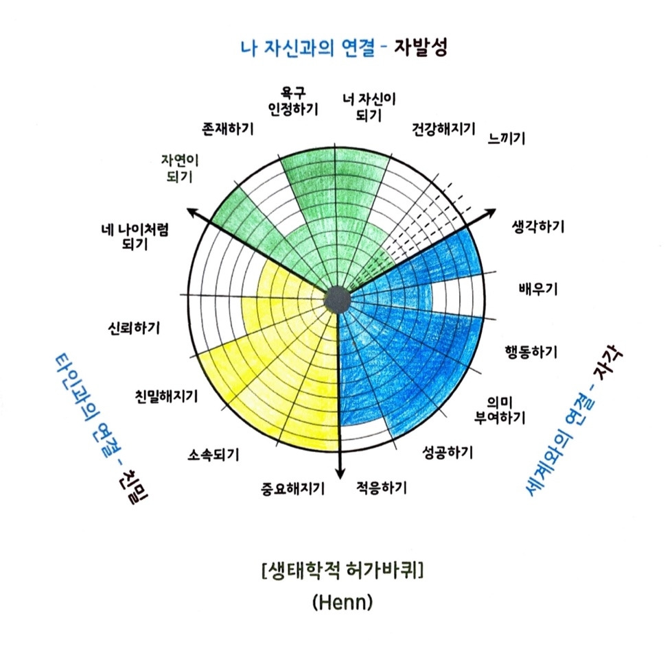 아래의 그림은 Henn(2023)의 '생태적 허가바퀴'를 우리말로 번역하여 제가 그대로 만들어본 것입니다. 저는 집단상담 프로그램을 진행할 때 '허가의 힘 확인하기'라는 활동지를 제공하며 이 허가바퀴의 동심원을 자신의 힘만큼 색칠하여 채워보라고 합니다.