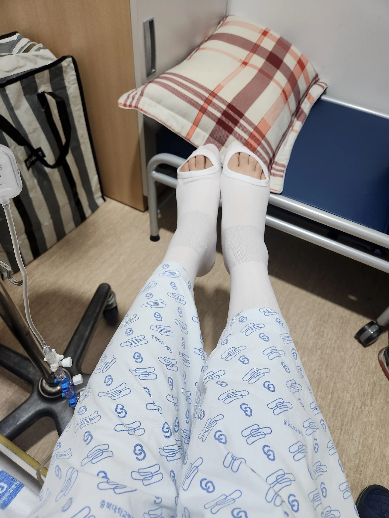 환자복으로 갈아입으니 진짜 환자가 된 기분~나 진짜 환자인지 아직 실감이 없었는데.... 내일 수술 후 혈전 방지를 위한 압박스타킹도 신었다.